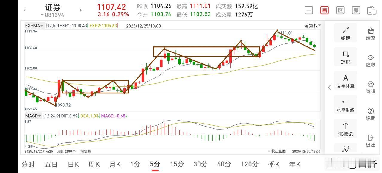 聊聊证券板块(2025.12.25) 今天受到逆回购投放利好刺激,证券板块又有了一个小幅反弹,但市场并没有出现普涨现象,说明此处是有分歧的,在之前文章中讲过,在下跌走势中,主力机构往往会借利好而选择高抛低吸,从证券板块结构上看,也处于较大的风险之中,还是维持近期观点,短期继续看空,仍以空仓观望为主。 1.从30分钟图一上看,目前围绕三买构建的中枢做上下震荡,此处的操作级别只有5分钟,所以在5分钟上走好短线是可以操作的,但空间有限,没有多大的操作意义,如今在次级别上已经出现趋势背驰走势,有向下变盘的技术需求。 2.从5分钟图二上看,目前形成了一个趋势背驰走势,注意一旦趋势背驰成立,那是会反转的,也就是说会转折向下的,是否成立,就看下午一笔5分钟回踩能否击破第二个中枢的DD点,我认为这种概率是非常大的。所以此处依旧是风险大于机会,是不宜操作的。 3.从沪指图三上看,目前构建了一个诱多型的下跌趋势,虽然看上去这笔日线反弹还不错,无奈成交量没有有效放大,在没有成交量的情况下,它的上涨都是需要打个问号的。 总之,在没有上涨买点出现之前,就是耐心等待,耐心等待好的买点出现。证券板块动态 股票交流