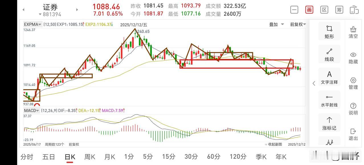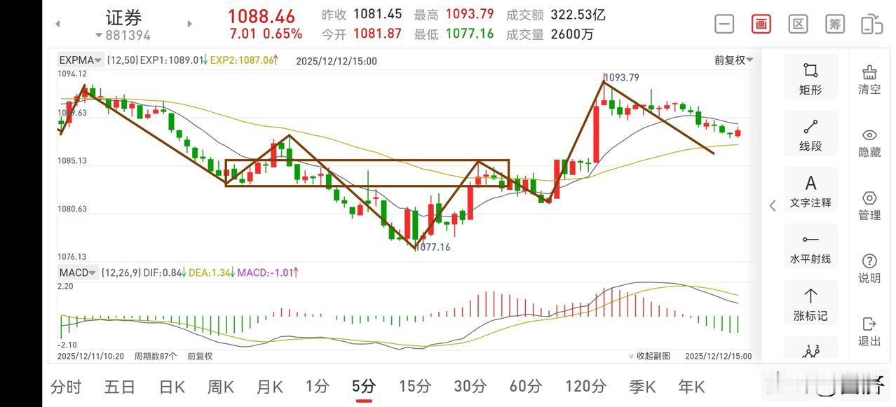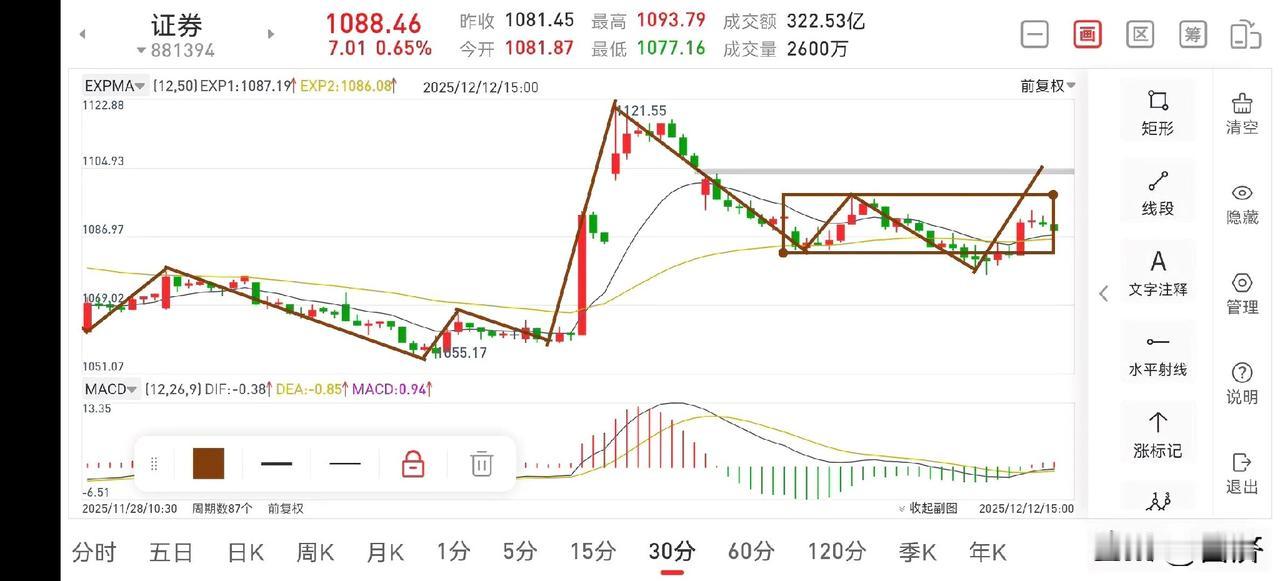 聊聊证券板块(2025.12.13) 证券板块经过一周的运行,发生了哪些变化,后面是看多还是看空,下面从各个级别具体分析一下。 1.从周线图一上看,本周虽然上涨了0.25%,但从结构上看,目前构建了一个周线下跌中枢,还没有离开段,所以从大方向上看,是一个向下走势,是看空的。 2.从日线图二上看,二个同方向的日线中枢有重叠构建了一个周线中枢,所以目前的操作级别是30分钟,也就是说,30分钟走好是可以考虑操作的,走坏就应该考虑清仓或减仓,那么接下去就看30分钟上的变化。 3.从30分钟图三上看,目前正在构建一个30分钟的下跌中枢,由于周六又出逆回购投放利好消息影响,该中枢有望构建诱多型的下跌中枢,有望回补上方缺口,但在趋势向下的情况下,任何利好都只是昙花一现,行情是没有持续性的,周五介入三成仓位短线博弈做多的朋友可考虑在回补上方缺口后择时退出来。 4.从5分钟图四上看,目前正在回踩5分钟一笔,从而形成5分钟二买,然后才会向上突破,有望回补30分钟上方缺口,此笔短线博弈仅此而已,操作上切勿贪婪留恋。 总之,在大方向向下的情况下,任何操作就应该见好就收,不要指望太多,耐心等待快速下探到来后才会有好的操作机会,到时我也会做出友情提醒。