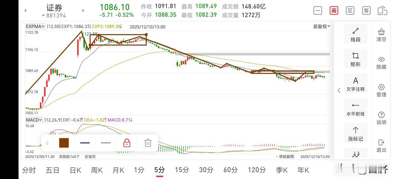 聊聊证券板块(2025.12.10) 这几天证券板块就不要指望了,就是一个震荡下行走势,目前虽不会出现大跌,但即使有反弹,也是弱势反弹,是没有操作价值的,此处只需场外观望即可。 1.从30分钟图一上看,目前正在回踩一笔,不管下午这笔回踩是否会结束,即便结束,也是一个弱势反弹,作为散户,没必要去理会。 2.从5分钟图二上看,目前已经有二个下跌中枢,截止上午收盘,是无法判断这笔30分钟回踩结束的。即便有机会短线操作,也要站上最后一个5分钟中枢上沿后回踩不破新低才可以考虑操作,但从目前来看,今天是不会出现操作机会的。 总之,在下跌趋势中,多看少动,有操作机会,我也会友情提醒的。