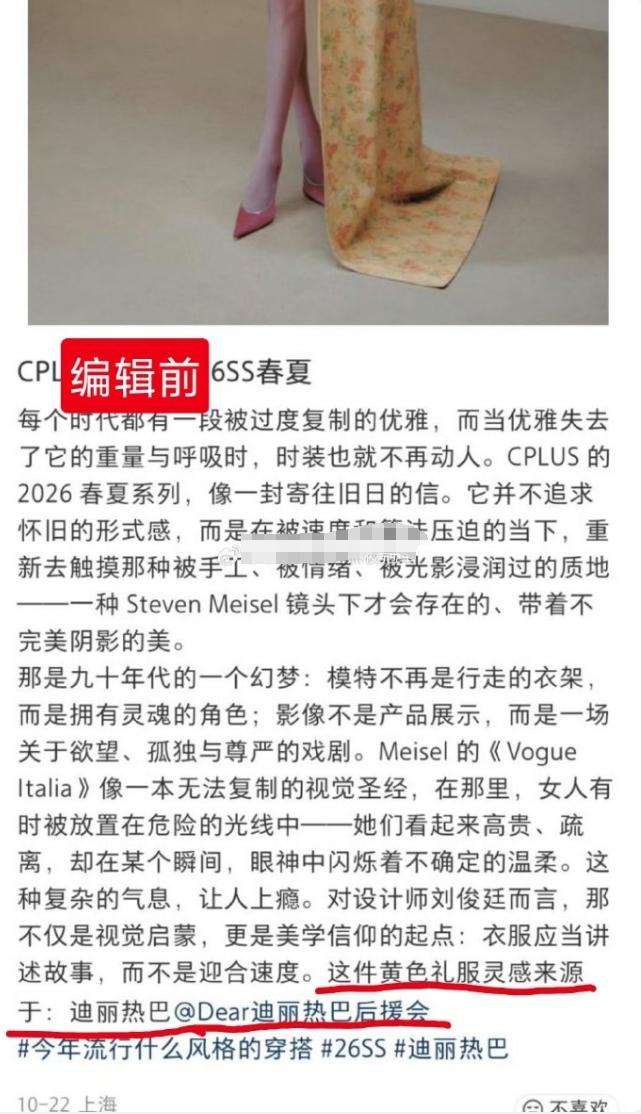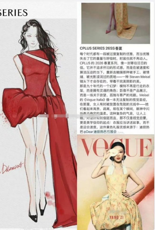 杨紫的VOGUE封面登的有点难受 原本能登上香港VOGUE是件好事,毕竟内娱登上香港VOGUE的女星就刘诗诗一个,但是杨紫其中一件黄色礼服,设计师10月份就发过设计灵感来自于迪丽热巴,还@了迪丽热巴粉丝后援会,如今杨紫VOGUE上身之后被迪丽热巴粉丝发现,设计师重新编辑了文案,赶快删掉了设计灵感来源。