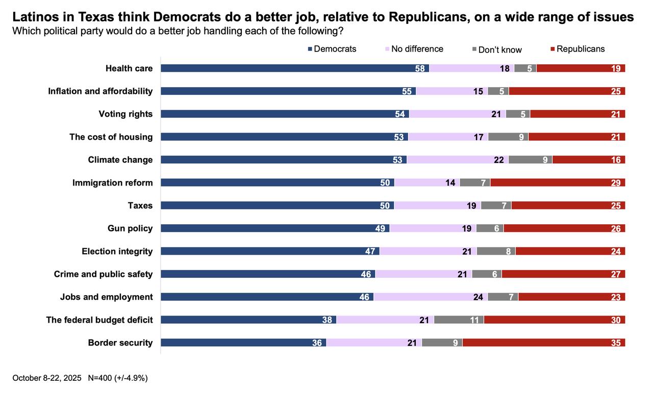 得州依然是特朗普的稳固票仓,但随着2025年接近尾声,其经济政策的负面效应正逐步显现,并可能在2026年中期选举中反噬共和党。特朗普在2024年总统选举中以56%的得票率赢下得州,共和党也延续了对州议会的长期控制。然而,多项民调显示,选民对经济前景的不满正在上升,尤其是在通胀、就业和可负担性问题上,越来越多得州选民将责任归咎于特朗普及共和党。非营利组织UnidosUS发布的调查显示,三分之二的受访者认为特朗普和国会未能改善民生。在得州受访者中,认为民主党更擅长应对通胀和生活成本的比例(55%)明显高于共和党(25%)。经济压力在多个层面显现。达拉斯联储指出,特朗普政府加强移民执法的行动已对得州经济产生外溢影响,移民突查波及永久居民和留学生,引发的恐惧情绪降低了劳动力出勤率和消费活动。联储调查显示,13%的企业表示招聘和留人更困难。 图片来源于网络