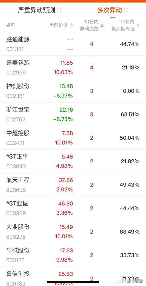 今天1家异动4次,2家异动3次 昨天胜通能源异动4次,10天正向异动4次小黑屋自我反省! 嘉美今天10天4次正向异动,停牌概率加大! 昨天严重触发异动浙江世宝、神剑主力今天开始避异动! 胜通、嘉美单飞没有梯队; 神剑商业航天空间龙"暂时卡异动"倒下,小弟大业已经上位!但大业已经2次,注意高度!
