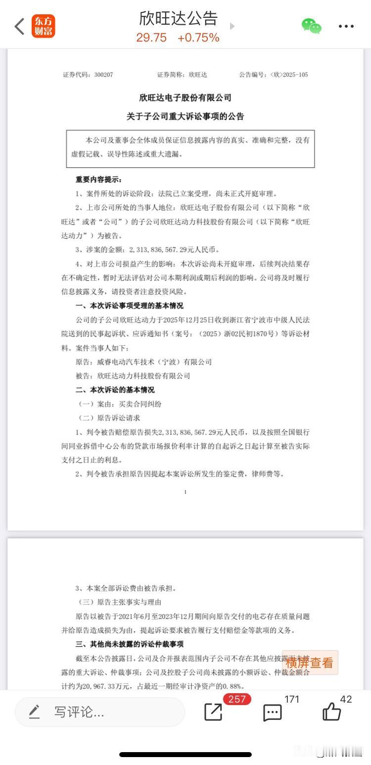 持有这家上市公司的晚上失眠,围观的回避该股 没有持有的避雷,关联的也避开! 周末消息:欣旺达子公司欣旺达动力因买卖合同纠纷被威睿电动汽车起诉,涉案金好多小目标(23.14亿元),原告称其交付的电芯存在质量问题并索赔。法院已立案但未开庭,判决结果存不确定性,暂无法评估对公司利润影响,公司其他未披露小额涉诉金额占净资产0.88%。短期大利空! 欣旺达热点概念:固态电池,小散无能为力….