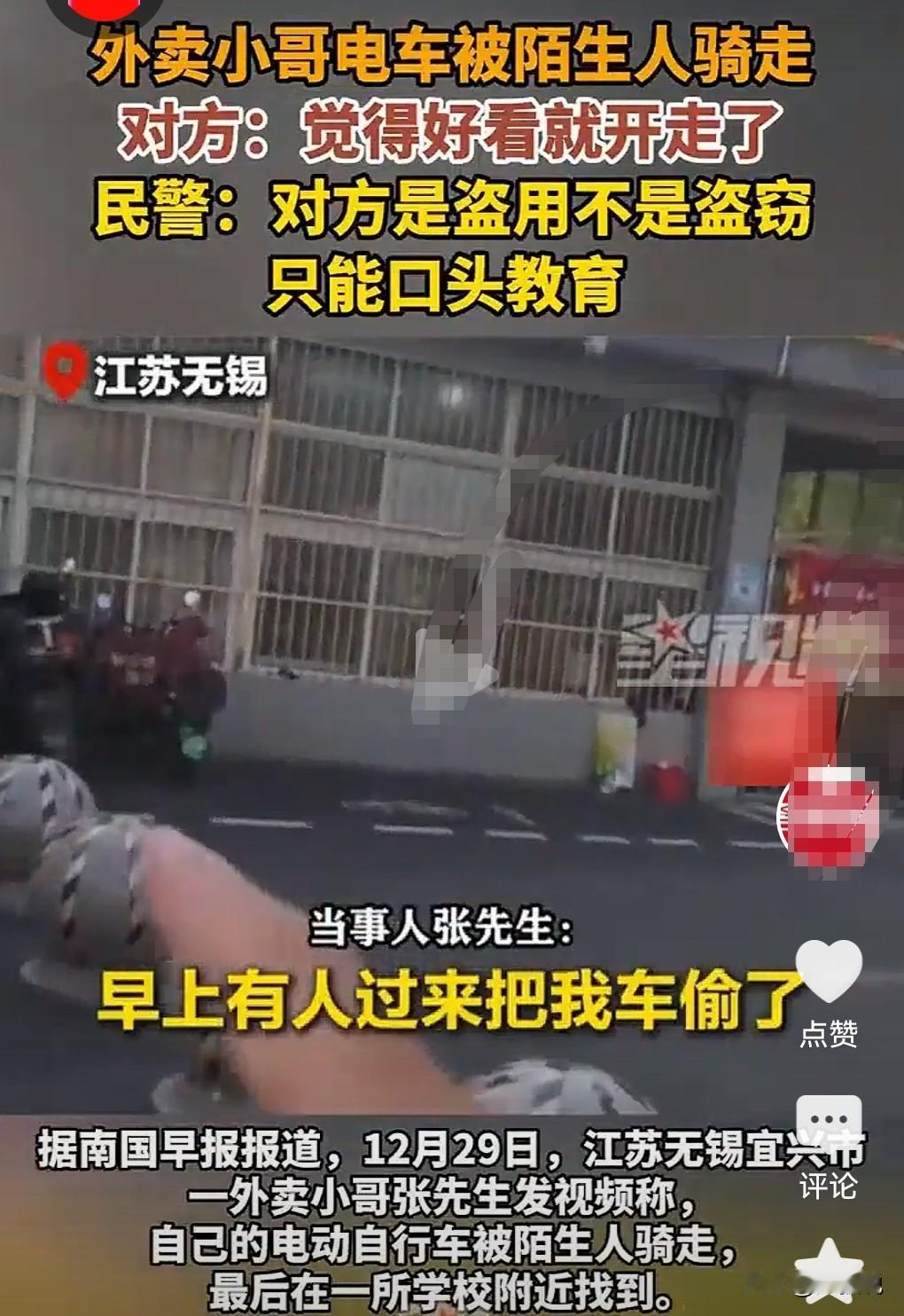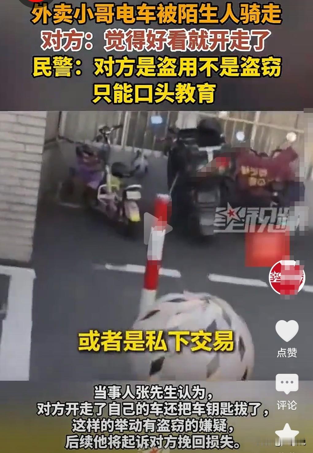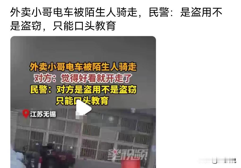 这也太离谱了吧,如果不是在网上亲眼所见,我是万万不敢相信,还有这么离谱的事情。 近日江苏无锡,外卖小哥的电车被陌生人骑走了。 警察说是盗用不是盗窃,因为没有卖掉,所以只能够口头教育。 这违法成本也太低了吧,要是没找到这车,那岂不就是丢了吗? 这难道还不算盗窃? 外卖小哥要男子赔偿损失,对方还不赔,太嚣张了。 男子不仅把车开走,而且还把钥匙拔走了。 真的是太丧心病狂了。 外卖小哥决定用法律维权。 一定要让这名男子付出应有的代价才行啊,男子的行为真是无法无天。