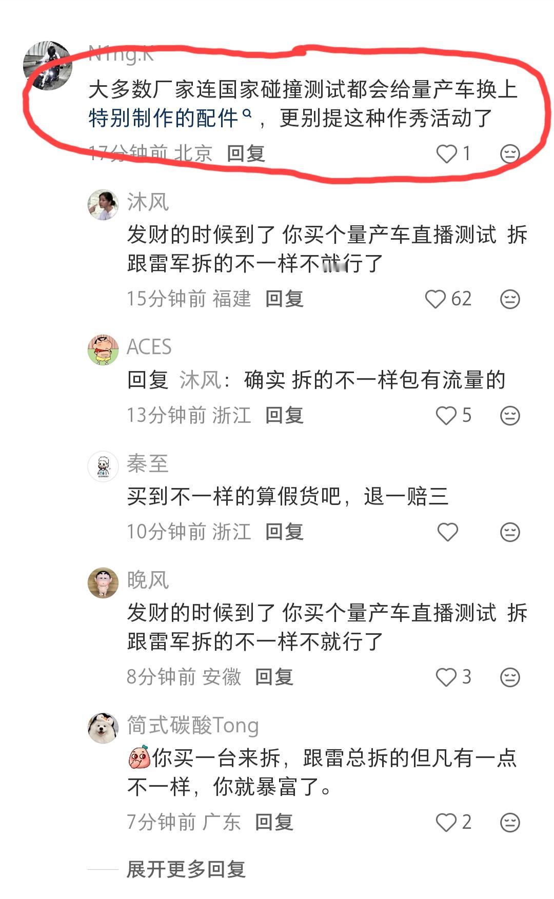 雷总跨年直播准备给大家拆一台小米yu7看看。 有网友在评论区表示:大多数厂家连国家碰撞测试都会给量产车换上特别制作的配件,更别提这种作秀活动了。 立刻有网友在评论区怼上了:你要否定小米就单独说小米就行,别把全行业带上,张口就来啊! 要我说,换特别制作的配件肯定不至于,小米汽车的配件绝大部分还是过硬的,现在网上质疑的根本不是这一方面。你即便拆出来的都是市场上最好的用料也平息不了网友质疑的声音。 而更多网友关心的则是这次直播间的评论区还会不会关?