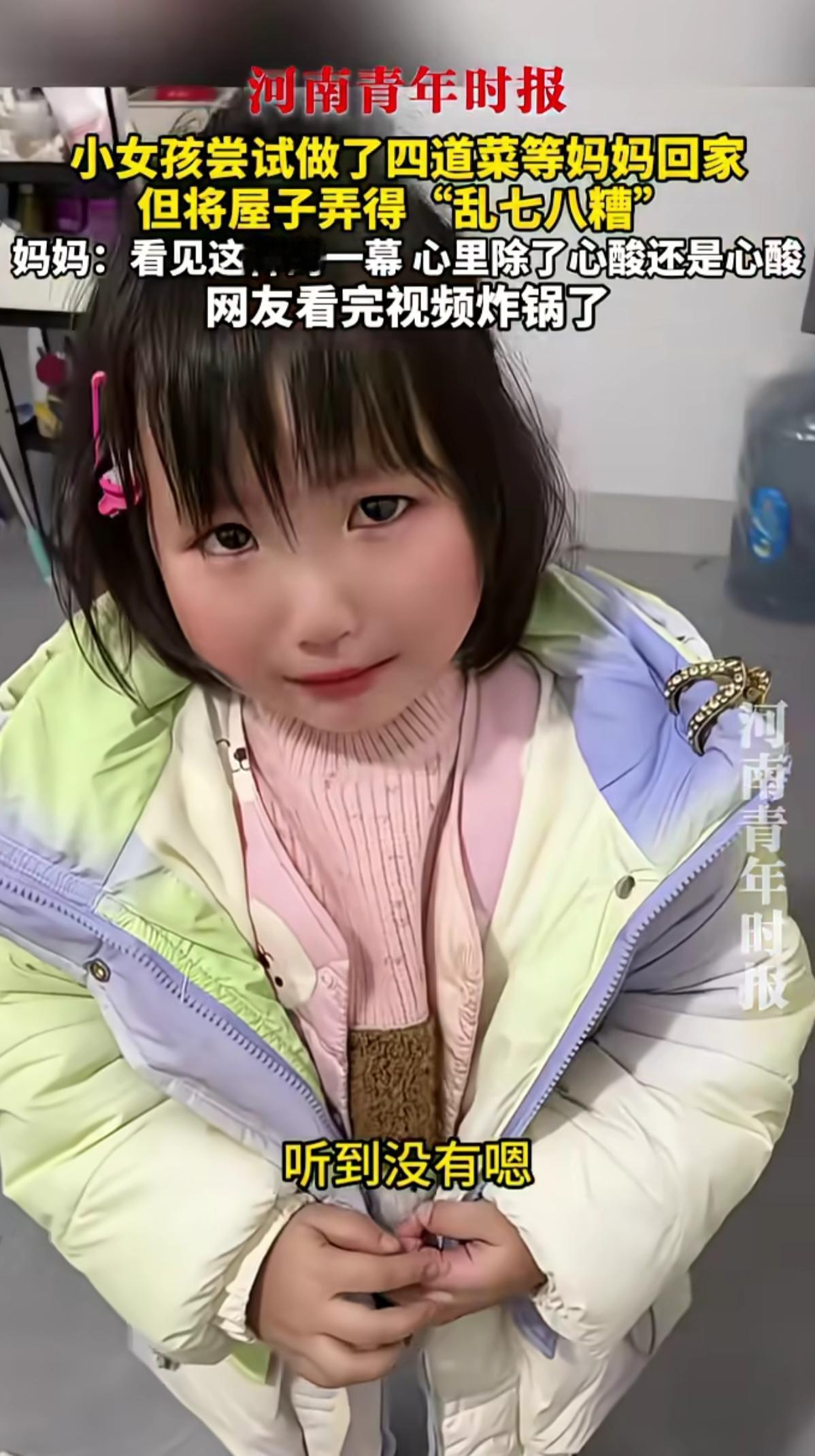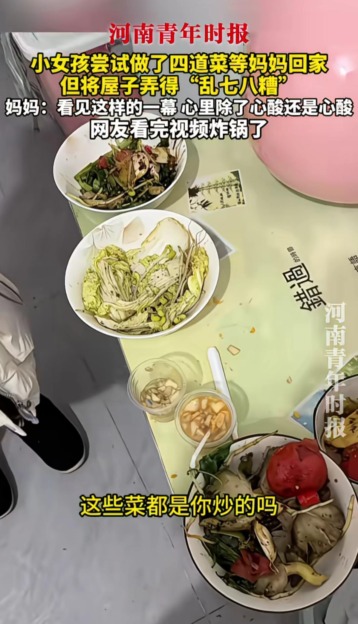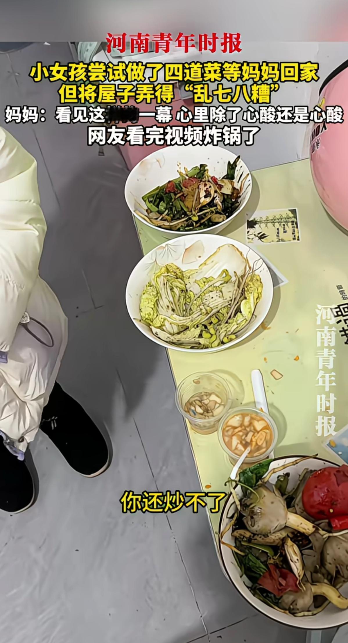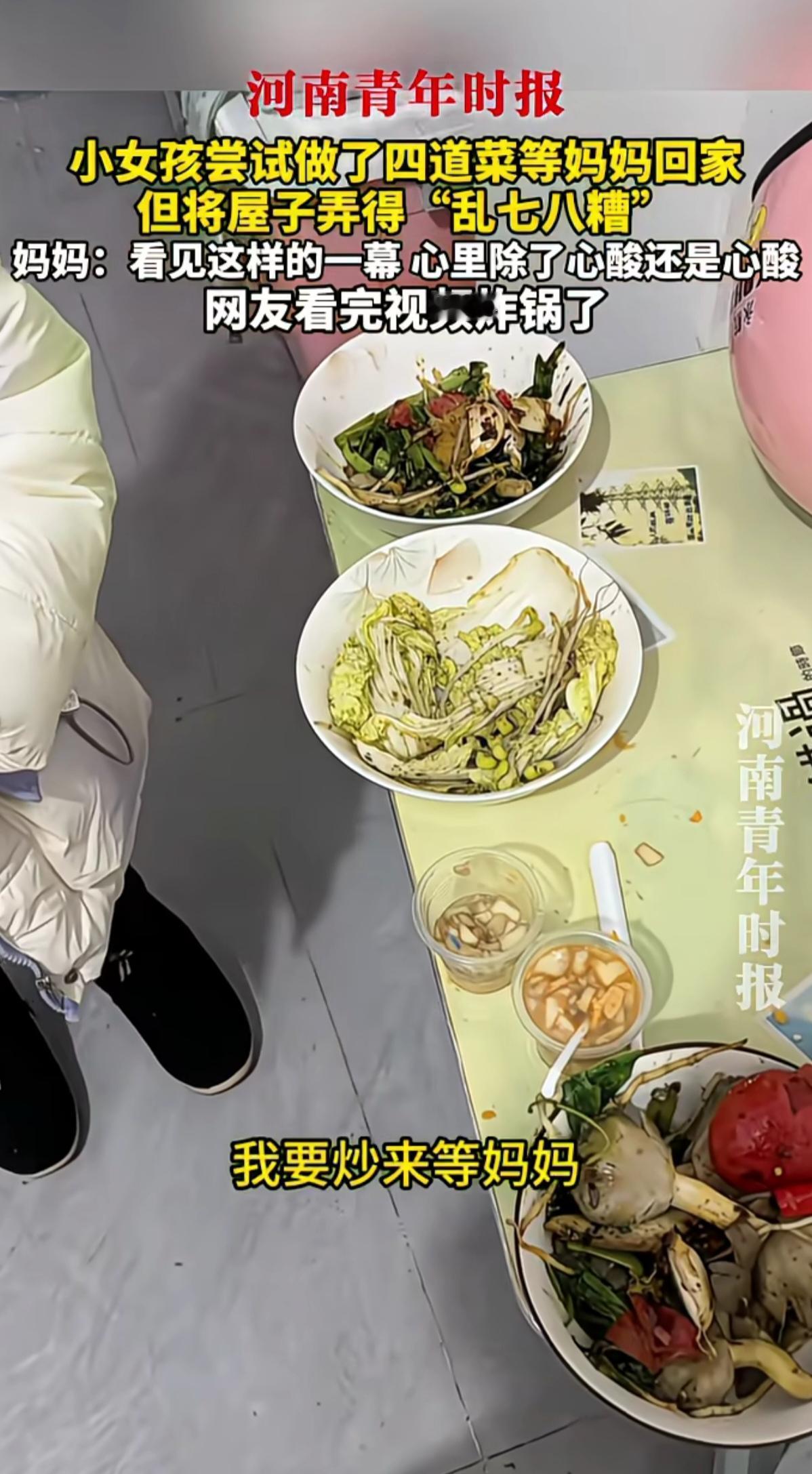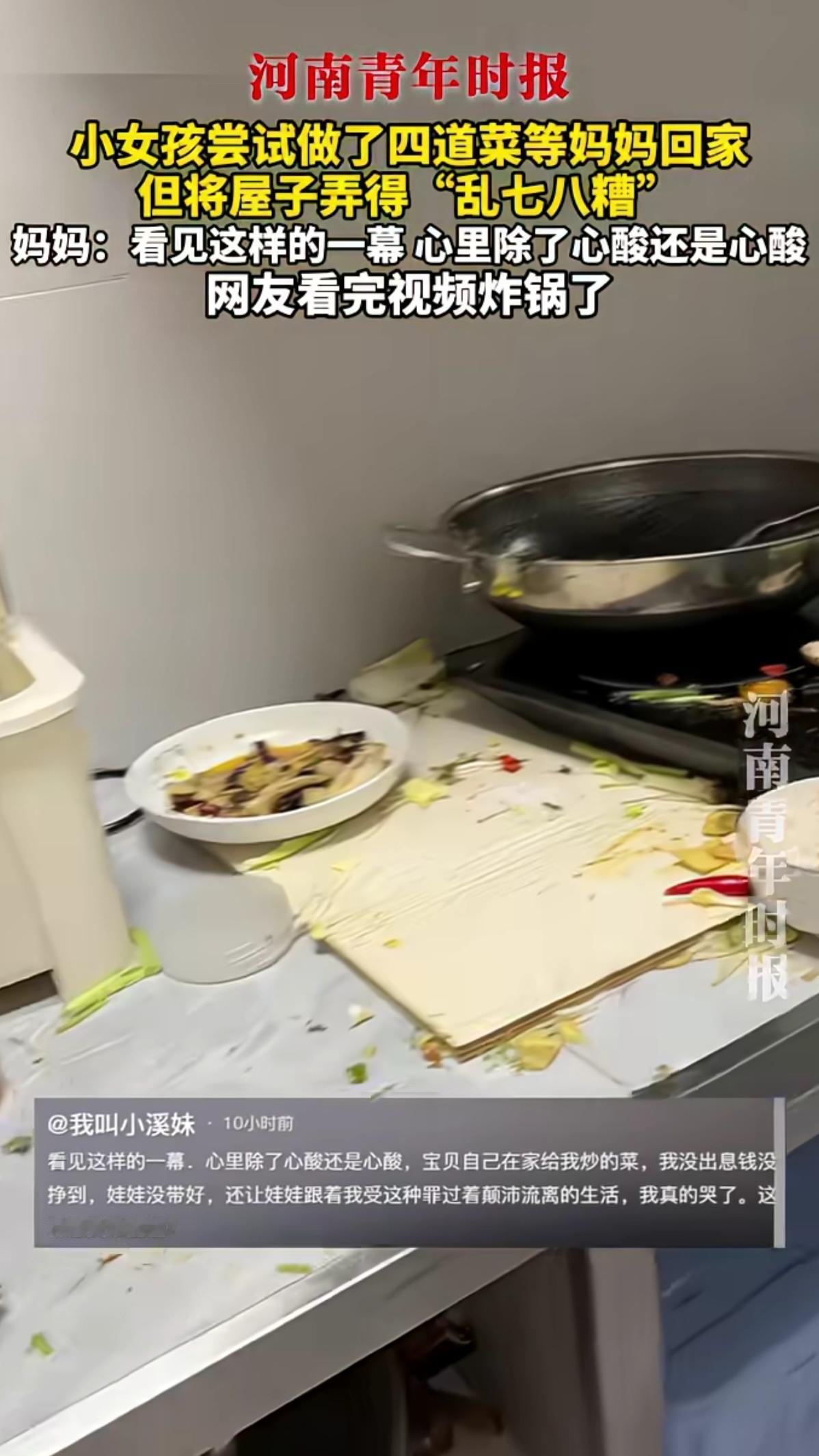 如果是你,回家看到这一幕,是欣慰还是生气? 妈妈回到家,看到女儿做了四道菜,厨房里弄的乱七八糟,妈妈问:这些都是你炒的啊?孩子说是,我要炒好了等妈妈 此时妈妈的心除了心酸还是心酸,她叮嘱女儿,下次一定不要再炒了,你还太小了 看着一片狼藉的厨房,她心里只有对女儿的愧疚,哭自己没本事,钱没挣到孩子没带好,让孩子跟着自己吃苦,孩子懂事的让人心疼,这么小自己在家,还想着给妈妈做饭让妈妈不那么辛苦 我家孩子也试着做过饭,我全程盯着都不放心,这小姑娘还好没啥事,这么小的孩子做饭多危险啊,用刀切菜,烧油炒菜,一不小心可能就划破手或者烫到,妈妈想想就难过 新的一年了,祝愿她们的生活越来越好