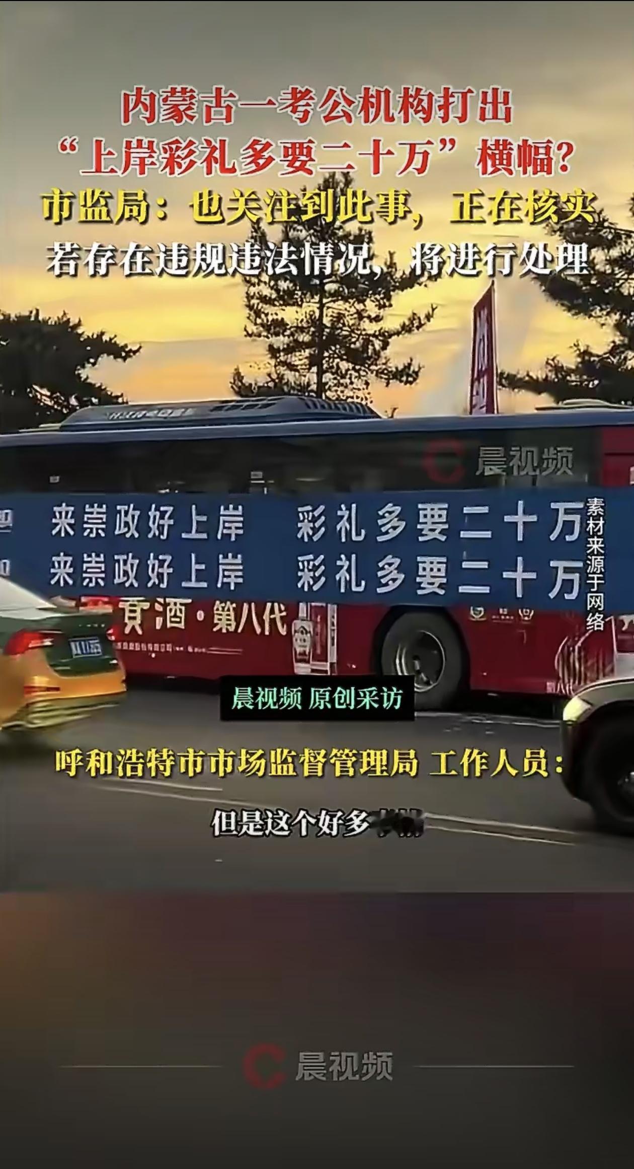 最近内蒙古呼和浩特市一家考公培训机构,居然在公交车上挂出“来崇政好上岸,彩礼多要二十万”的横幅,这操作直接把网友们看懵了。 事情是这样的,有网友在社交平台发了段视频,画面里一辆公交车侧面挂着醒目的红色横幅,白底红字写着“来崇政好上岸,彩礼多要二十万”。视频定位显示在呼和浩特,周边车辆都是“蒙A”车牌,不少人认出这是当地一家考公辅导机构。这条视频像颗炸弹,瞬间引爆网络,评论区直接炸锅:“考公和彩礼有啥关系?”“这机构是教人考试还是教人算计婚姻?”甚至有人调侃:“难道考上公务员就能多要彩礼?这逻辑太魔幻了。” 随着视频发酵,更多细节被扒了出来。有网友发现,这家机构之前就爱用“保过”“包过”这类口号吸引学员,这次更夸张,直接把考公和婚恋金钱挂钩,把“上岸”这种原本代表通过考试的积极词汇,和彩礼这种社会敏感话题强行绑定。这种营销手段让很多人觉得被冒犯,尤其是年轻考生和家长,纷纷指责机构“为了赚钱没底线”“贩卖焦虑还物化婚姻”。 面对舆论压力,当地市场监管部门迅速行动。呼和浩特市赛罕区市场监督管理局在接到举报后,第一时间介入调查。工作人员核实发现,这条横幅确实存在,且内容涉嫌违反《中华人民共和国广告法》中关于公序良俗和禁止虚假宣传的规定。比如《广告法》第九条明确规定,广告不得含有“妨碍社会公共秩序或者违背社会良好风尚”的内容,而这条横幅把考公和彩礼金额直接关联,明显有误导性,容易让公众产生“考上公务员就能多要彩礼”的错误认知。 调查结果出来后,监管部门立刻责令该机构停止所有营销活动,并立案调查。律师分析指出,这种行为不仅可能面临罚款,情节严重的还会被吊销营业执照;如果机构因此非法获利超过10万元,甚至可能触犯《刑法》中的虚假广告罪,负责人要承担刑事责任。 这次事件再次给行业敲响警钟,在竞争激烈的市场环境下,靠博眼球、打擦边球的营销或许能短期吸引流量,但长期来看,只会消耗公众信任,最终被市场淘汰。毕竟,考生和家长需要的,是真正能提升能力的培训,而不是这种把考试和婚姻都变成生意的荒诞闹剧。来源:潇湘晨报
