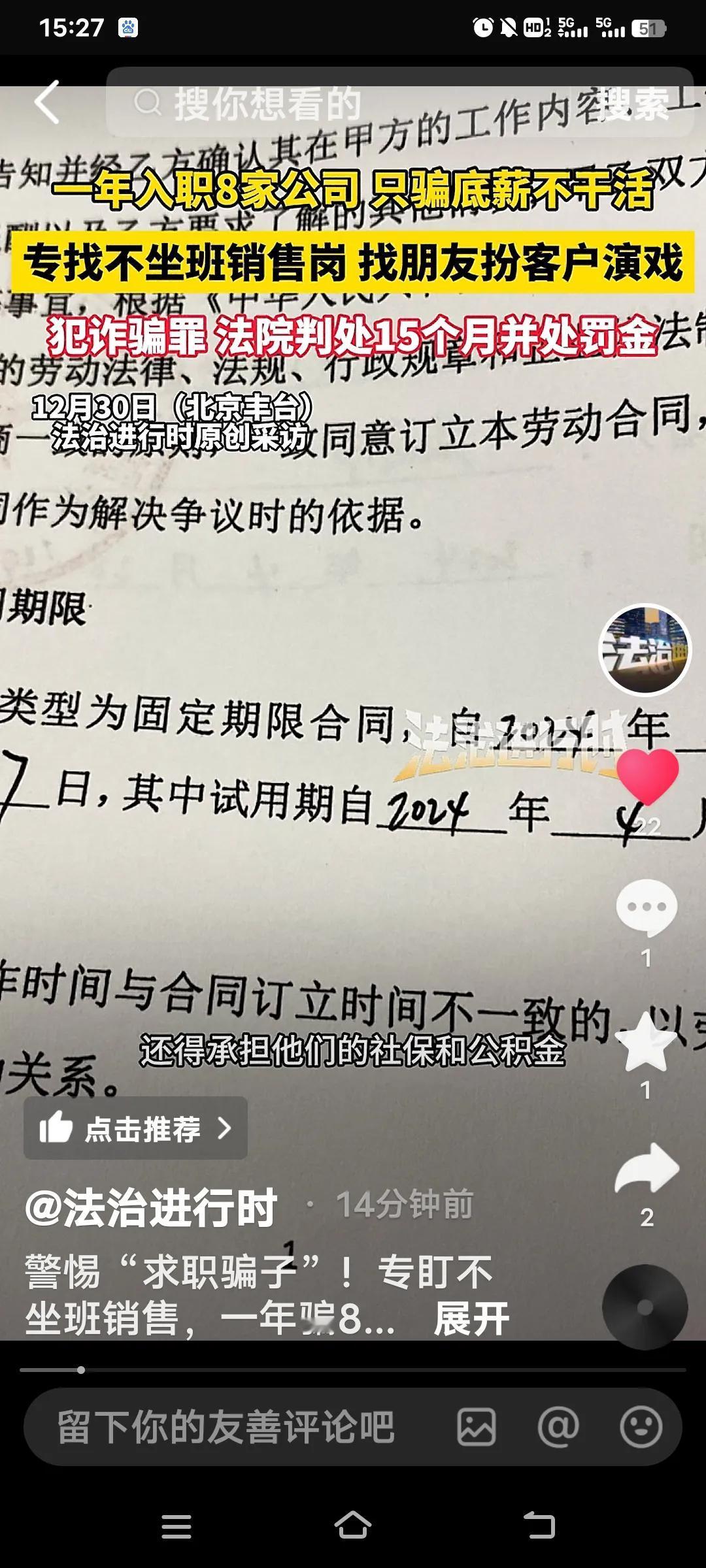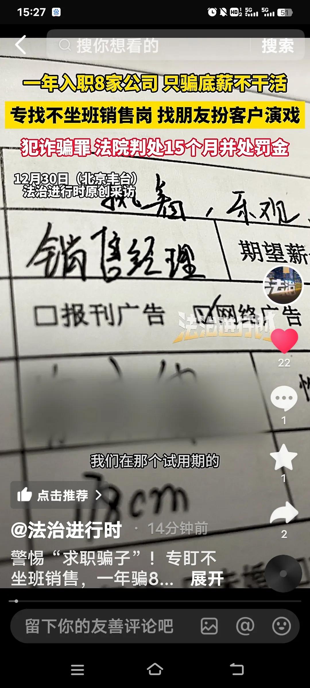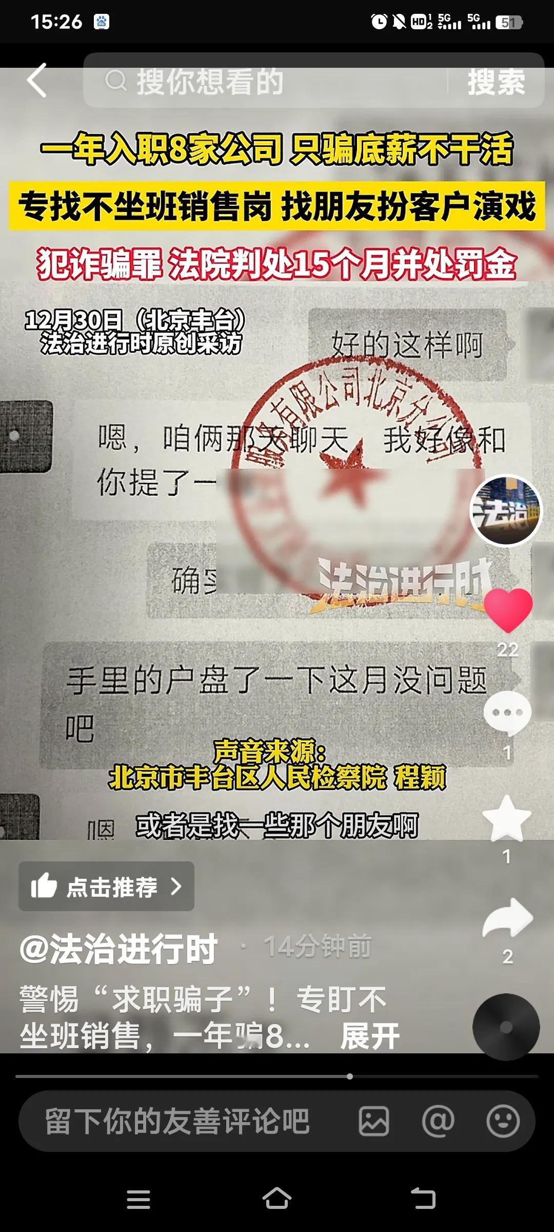如今职场上竟出现了这般“人才”,一年里入职八家公司,只为骗取底薪而不干活。此人专挑坐班制公司下手,还找来朋友佯装客户,演技十足。 最终,其因犯诈骗罪被判处15个月刑期,并处罚金,该行为致使公司亏损达17万。这算盘打得可真够精的! 说到底,再出色的演技也终会被识破。正所谓,行得端、走得正,勤勤恳恳工作,本本分分做人,才最为重要! 职场老实人 职场傻行为 求职遭骗