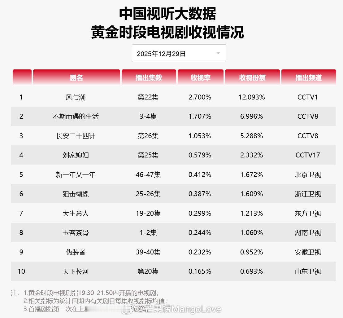 【2025年12月29日中国视听大数据CVB黄金档电视剧收视率日榜TOP10】1 风与潮 CCTV12 不期而遇的生活 CCTV83 长安二十四计 CCTV84 刘家媳妇 CCTV175 新一年又一年 北京卫视6 狙击蝴蝶 浙江卫视7 大生意人 东方卫视8 玉茗茶骨 湖南卫视9 伪装者 安徽卫视10 天下长河 山东卫视