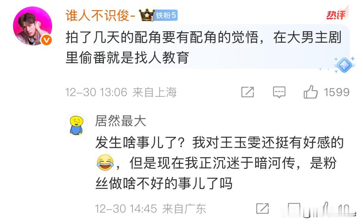 12月30日,龚俊粉丝建议《白衣公卿》剧方删掉王玉雯所有戏份!剧刚杀青,男主粉丝要求剧方删除女主所有戏份,这合理么? 了解了一下原因,发现又是番位问题,属实没必要,毕竟看过《地球超新鲜》的观众都知道他俩关系挺好的,王玉雯咖位不如龚俊是事实,王玉雯目前有在被力捧也是事实 他俩其实都属于事业上升期,热度上升期,现在的咖位不代表以后的咖位,番位也是,与其纠结现在,不如期待他俩的未来! 两家好好护剧才是正理! 龚俊