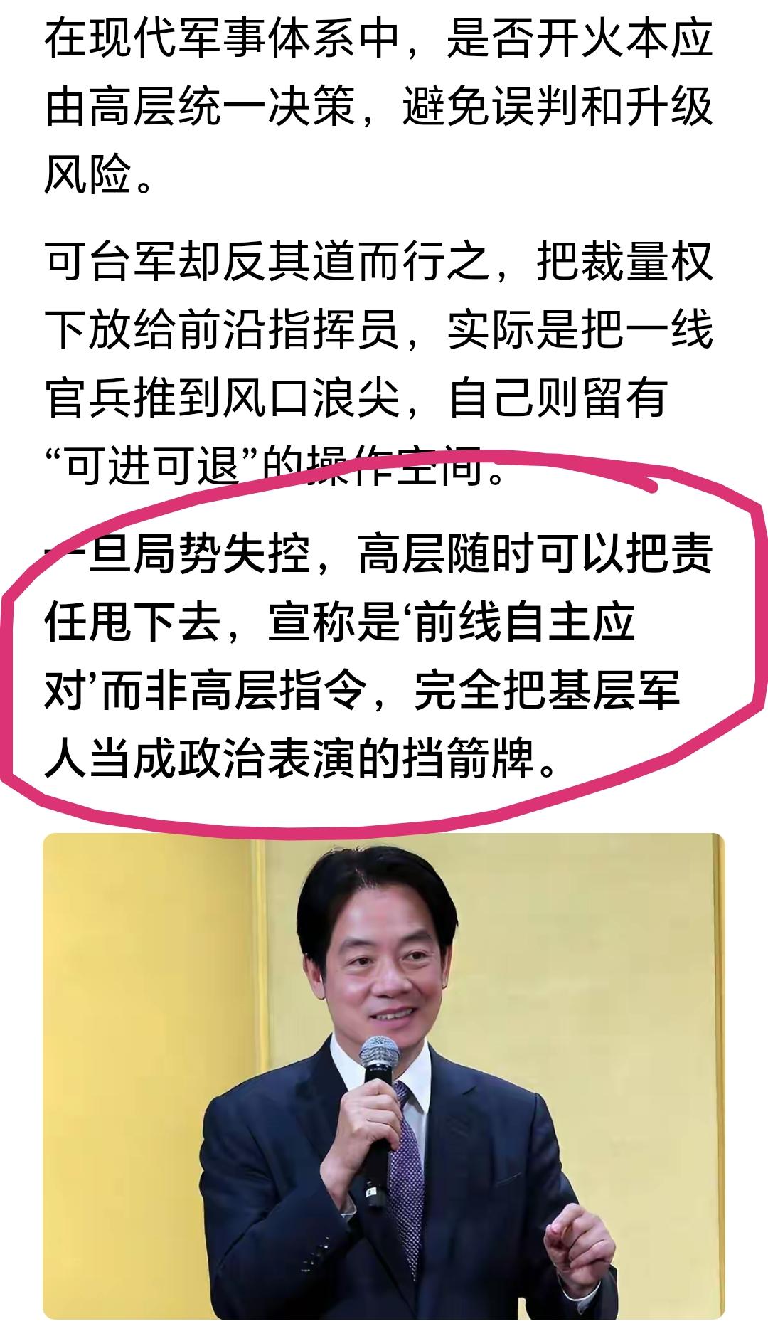 应该喊话台军兄弟,既然癞蛤蟆要让你们变背锅侠,那你们就应该勇敢地将天捅破。 谁让你们去送死,你们就干谁。 你们要勇敢地开出第一枪,但是这一枪是要对准癞蛤蟆。 顺便说一句,如果你们要帮癞蛤蟆打仗,你们死后家人肯定是没有抚恤金的哦。但是如果能将癞蛤蟆捆起来,你会是民族英雄大功臣,族谱都能单开一页。 自己看着办吧。 点右上角关注我,我们一起去看这个魔幻的世界
