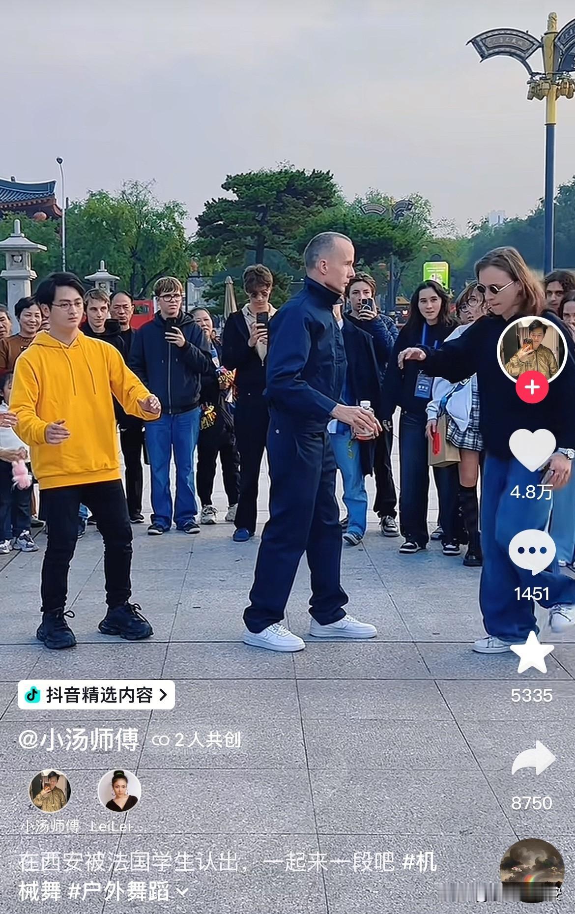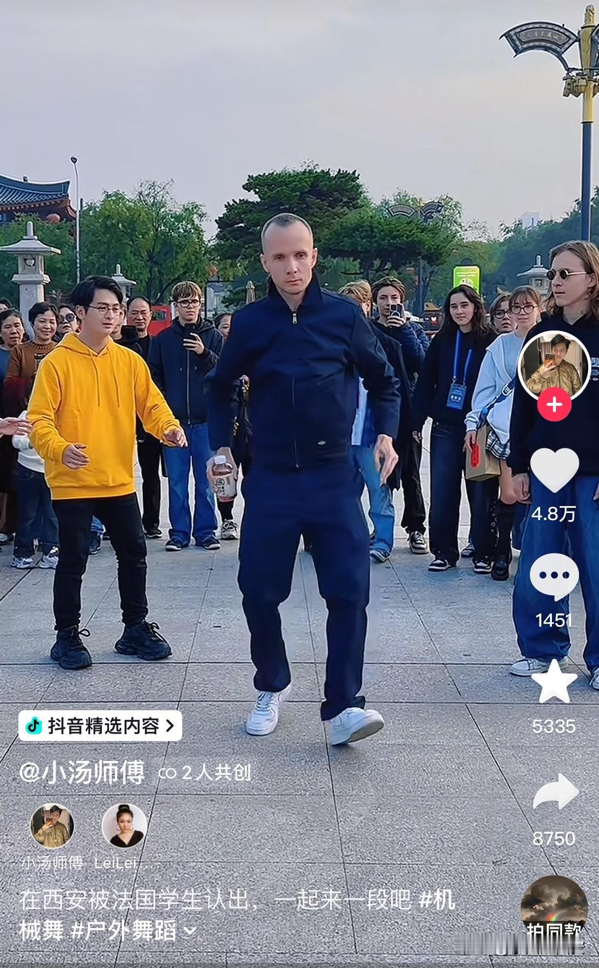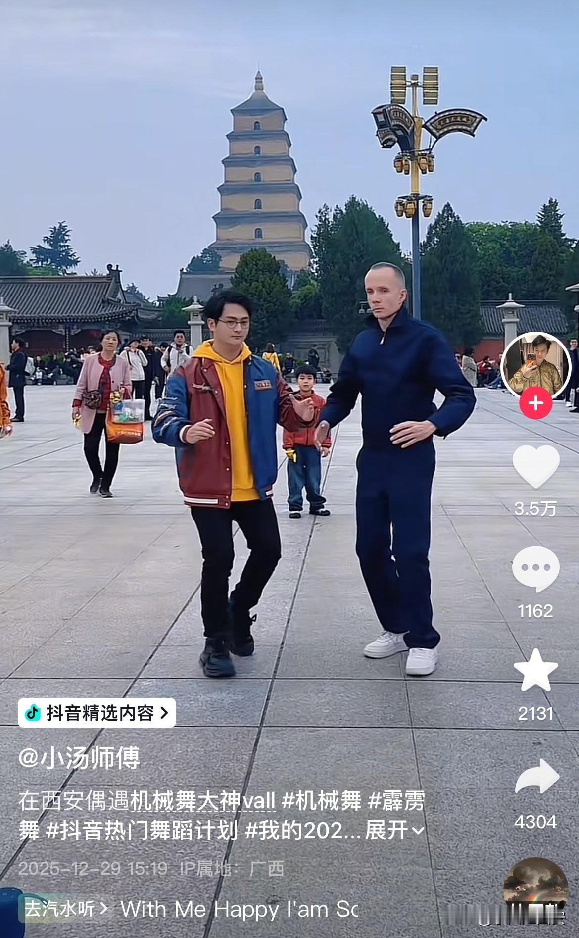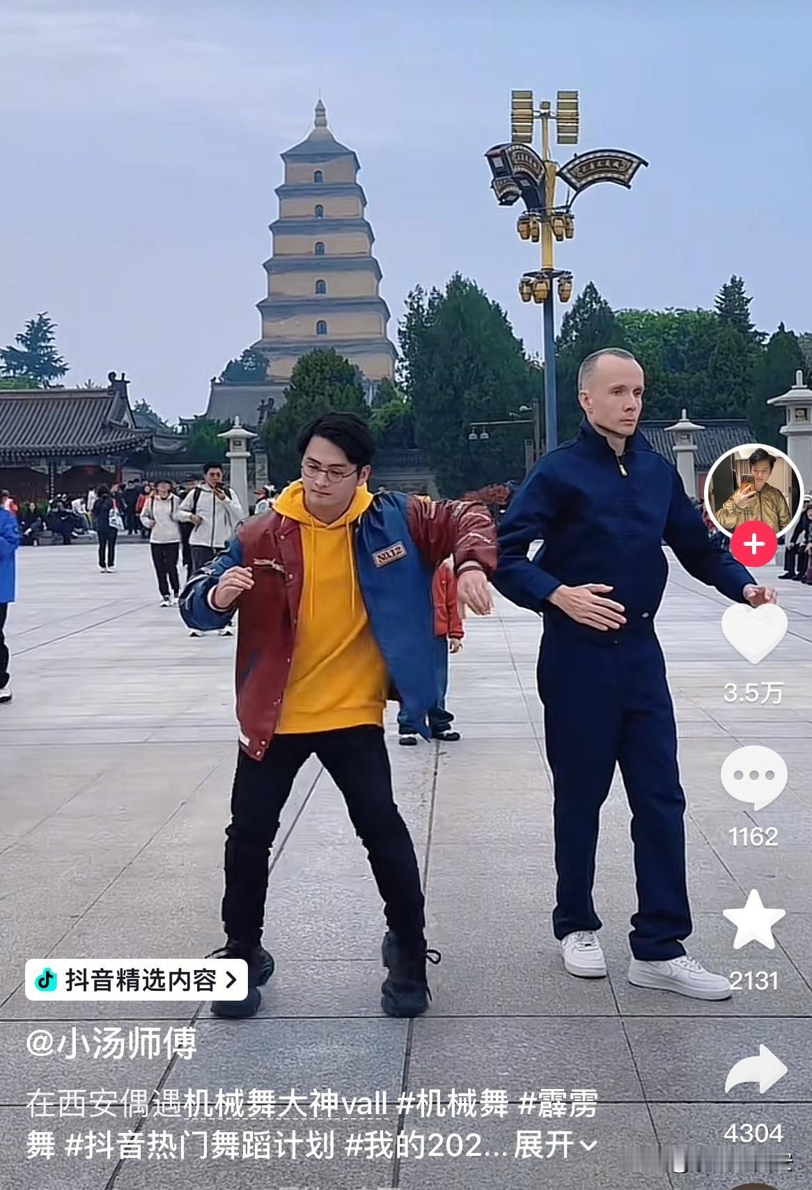 大雁塔南广场法国学生偶遇 俄罗斯机械舞大师VAll与国内机械舞 小汤师傅在表演机械舞,精彩的舞步 来回挪动, 好像真的机器人🤖行走一样, 吸引了众多国内外游客驻足其间。 分享城市新鲜事 机器人步态 怪异机械舞