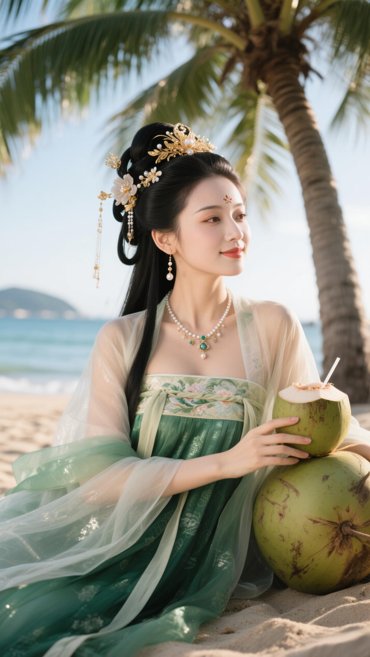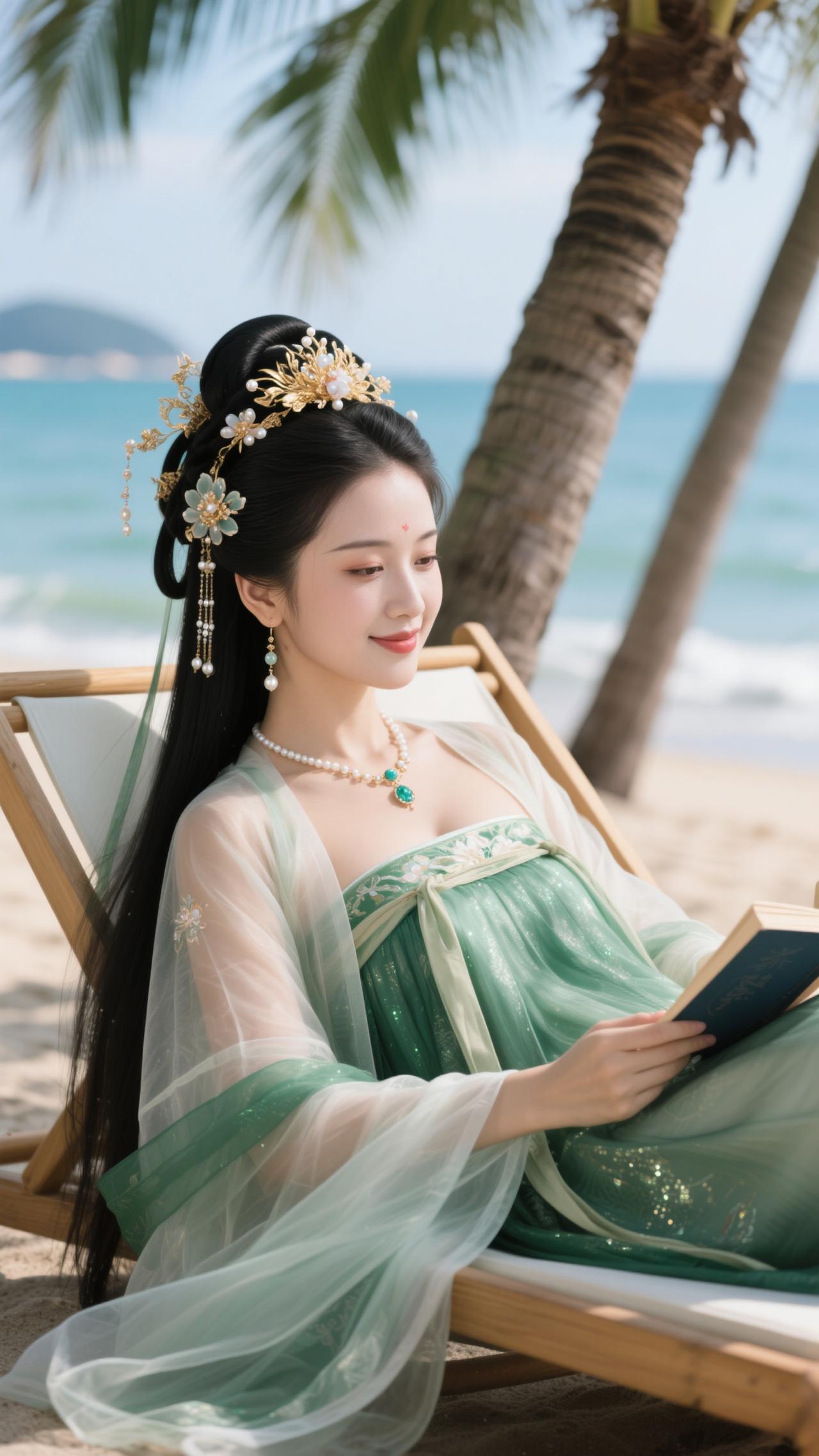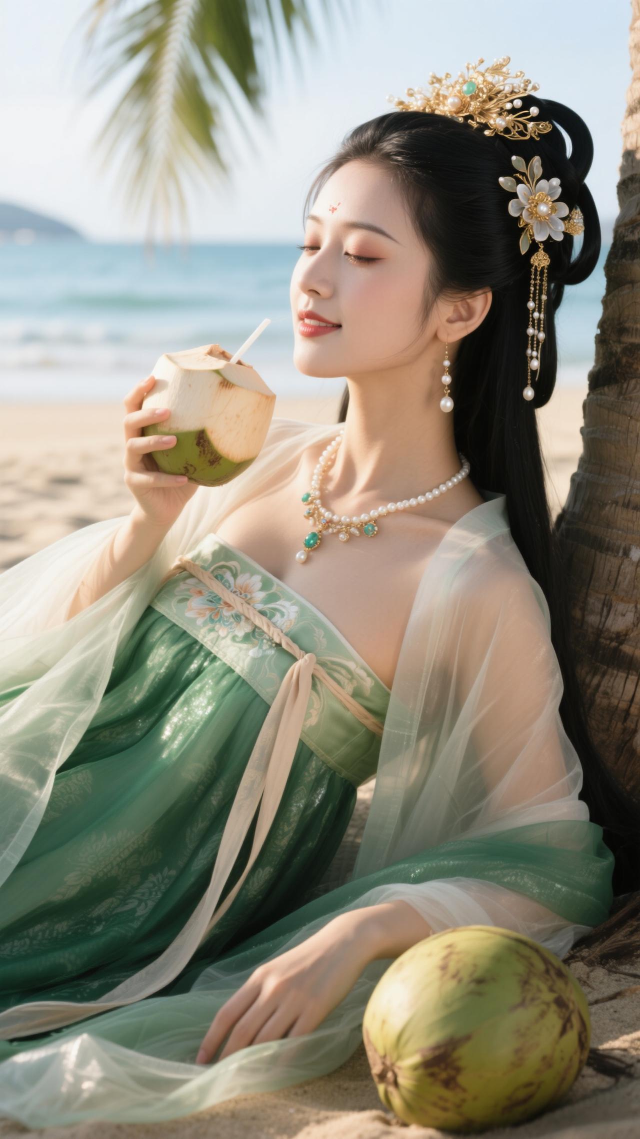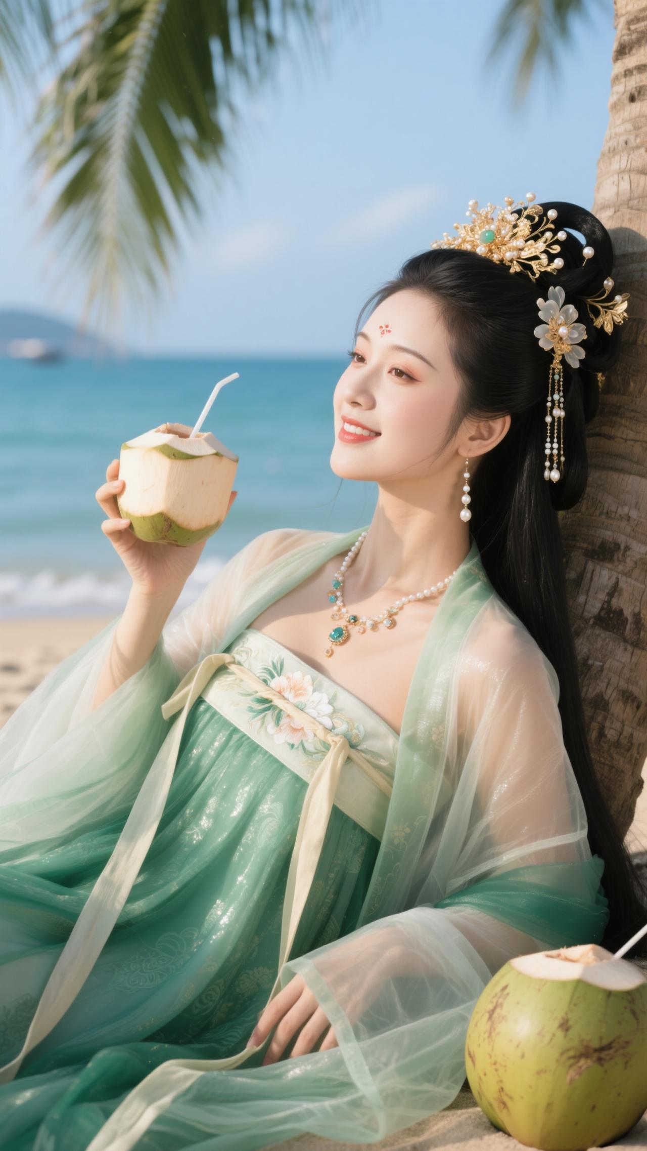 《浪淘沙·椰风海韵》 椰影曳金滩,浪吻云鬟。罗衣轻透碧琅玕。闲展素书风里卧,梦落沧澜。 珠翠映晴川,眉黛春山。潮声似共古音弹。一枕清宁鸥鹭伴,醉了流年。