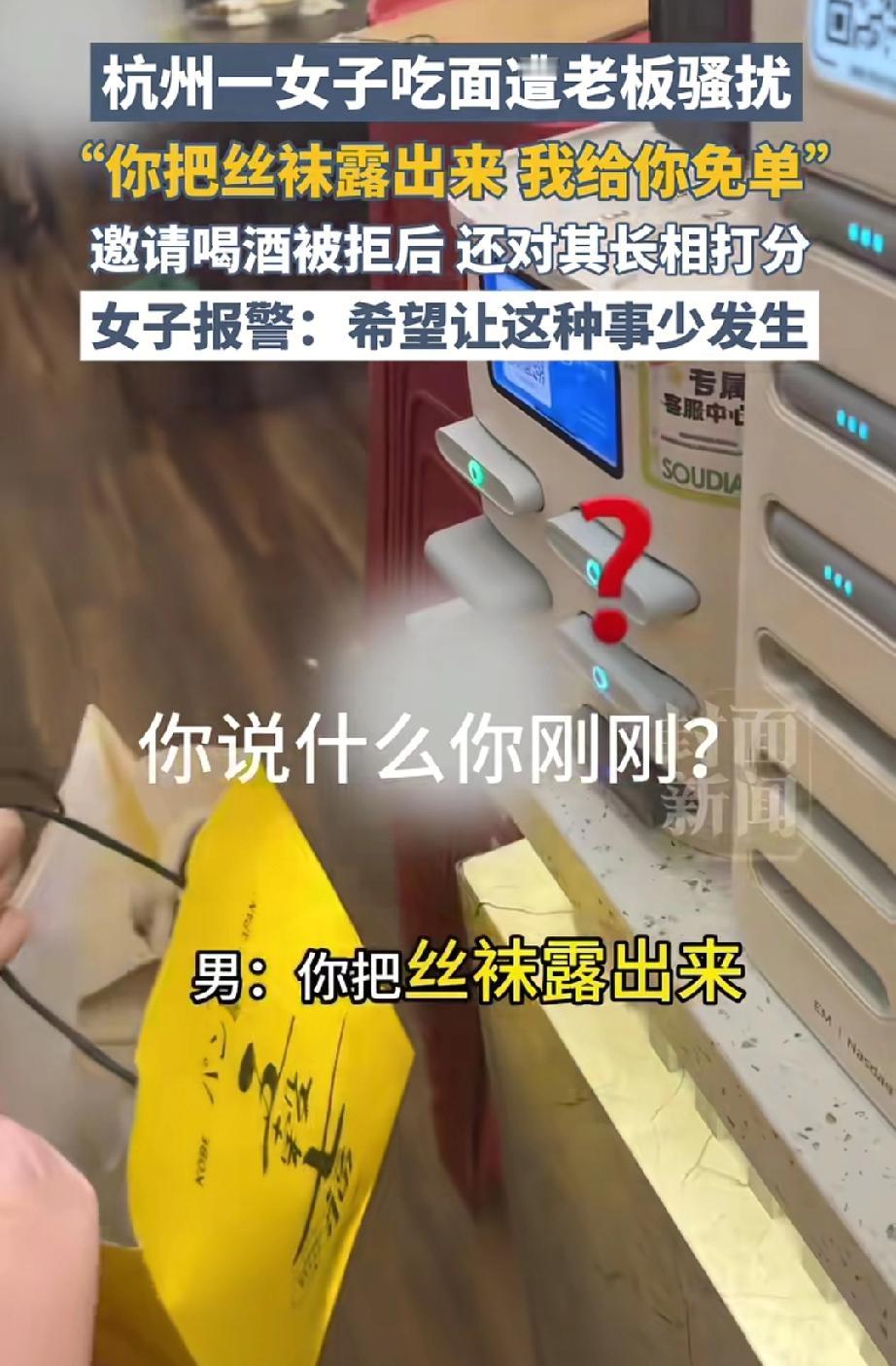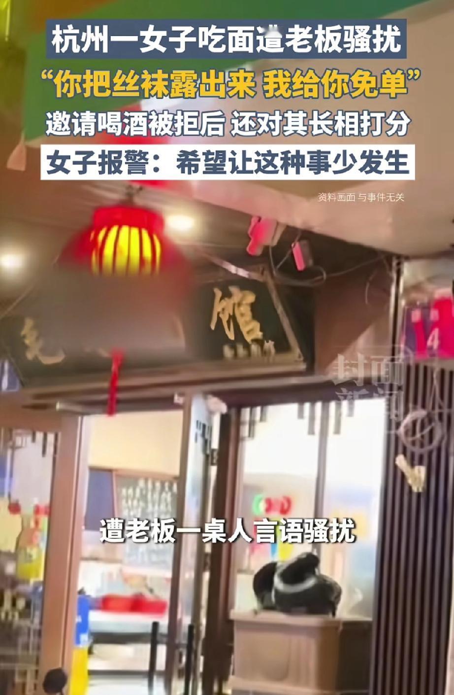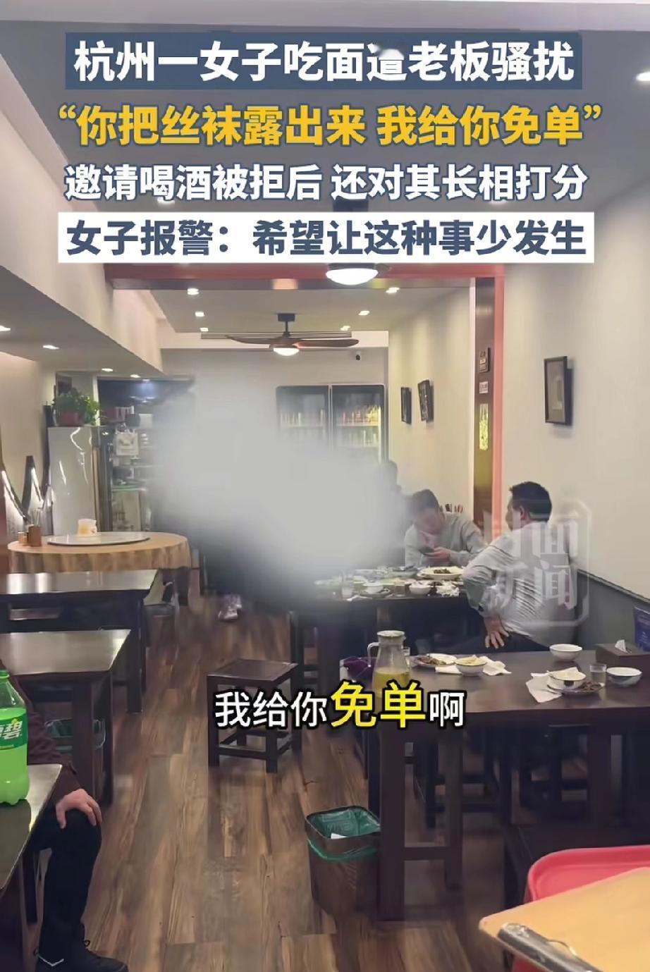 气炸!“露丝袜免单”,这谁能忍? 浙江杭州一女子和闺蜜来旅游,在一家面馆吃饭时遭老板骚扰。老板邀请喝酒被拒后,和他人一起对女子长相评头论足打分,结账时还说出“你把丝袜露出来,给你免单”的低俗言论。女子愤怒报警,嫌疑人被带回派出所,可涉事面馆仍正常营业。 女子和闺蜜本来开开心心来杭州旅游,打算逛西湖、逛灵隐寺放松一下。结果在一家面馆吃饭时,旁边桌一男子凑过来请她和闺蜜喝酒,被拒绝后,又和老板一起对着她俩评头论足,跟把人当商品一样打分议论。 女子和闺蜜只想赶紧结账走人,没想到老板更过分,结账时来了句“把丝袜露出来,给你们免单”。女子当场录像质问,老板还一副无所谓的样子重复这话,那态度简直让人火冒三丈。 网友们看到这事儿都气坏了,有人说“这老板太恶心了!旅游想放松结果遇到这种事,谁还敢去他家吃面”,还有人直言“必须严惩!这种把低俗当有趣的行为,就该让他付出代价”。 可不是嘛!大家出门旅游、花钱吃饭,图的是开心舒服,不是来被人骚扰、被人当笑话打量的。这种没底线的言论,根本不是玩笑,是对人的严重冒犯!换谁遇到这种事,不得气到发抖? 这件事提醒我们,遇到这种骚扰行为,千万别忍气吞声,就得像这位女子一样果断报警维权。商家做生意,靠的是诚信和对顾客的尊重,不是靠低俗玩笑和骚扰来博眼球。 咱们出门消费,要的就是被尊重的感觉。如果连最基本的尊重都没有,这样的店谁还愿意去?希望大家都能对这种骚扰行为零容忍,也希望每个商家都明白:尊重顾客,才是生意能长久的根本