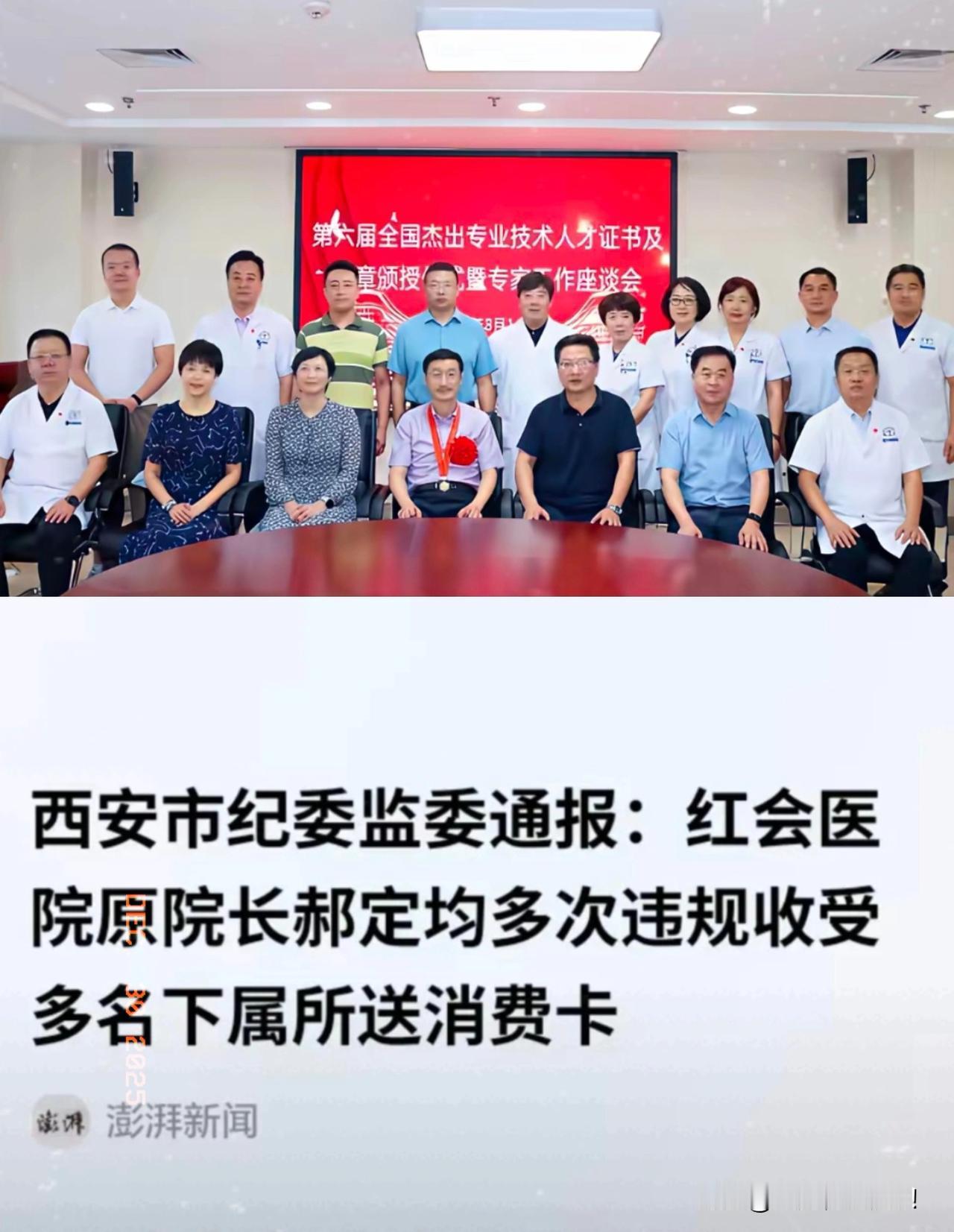 就在刚刚 2025年12月30日,西安红会医院爆出郝定均违纪违法案。 12月29日,西安市纪委监委发布通报,西安红会医院党委书记、院长郝定均涉嫌严重违纪违法,目前正在接受西安市纪委监委纪律审查和检察机关审查起诉。 据通报显示,郝定均担任西安红会医院院长十二年,在此期间,郝定均利用职务之便,收受下属消费卡,用于个人私用。 郝定均大权在握,属于医院的高级消费卡,经手人寥寥,他收下的消费卡用处不小。 据悉,郝定均今年上半年仍正常开展工作,9月份被开除党籍、公职,并移送检察机关审查起诉。 西安红会医院是西安顶尖骨科医院,院长郝定均是首席专家,在手术中使用医疗器械是有严格规定的,不排除郝定均在这方面存在问题。 郝定均外出时,有茅台美女相伴,这或许是权色交易的表现,他收下消费卡不止用此一处,可能有更严重的腐败行为。医疗卫生系统的反腐还在继续。