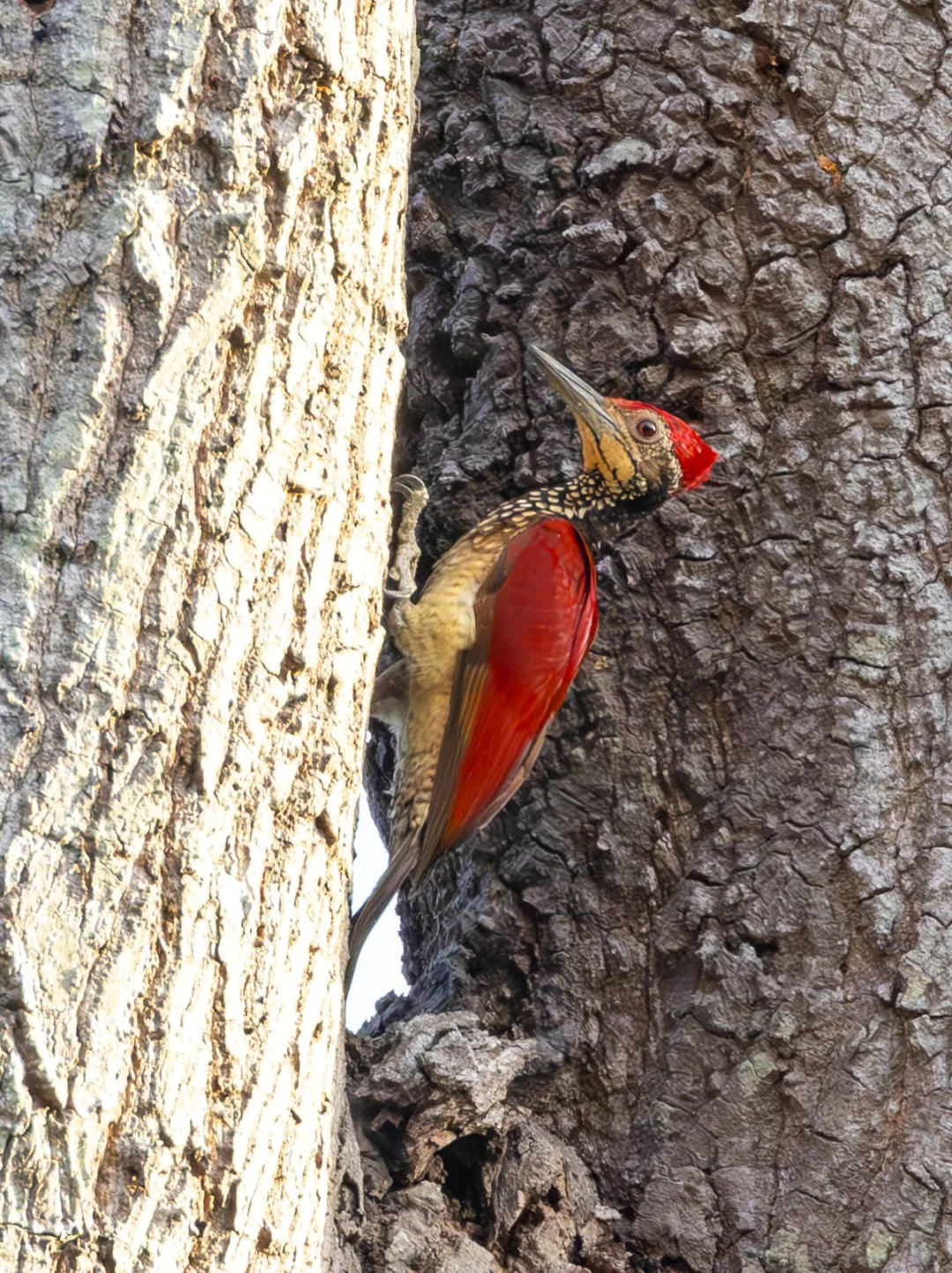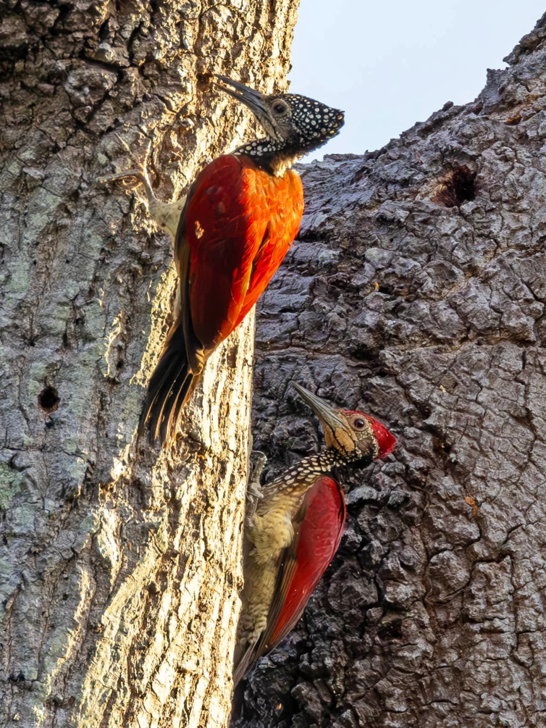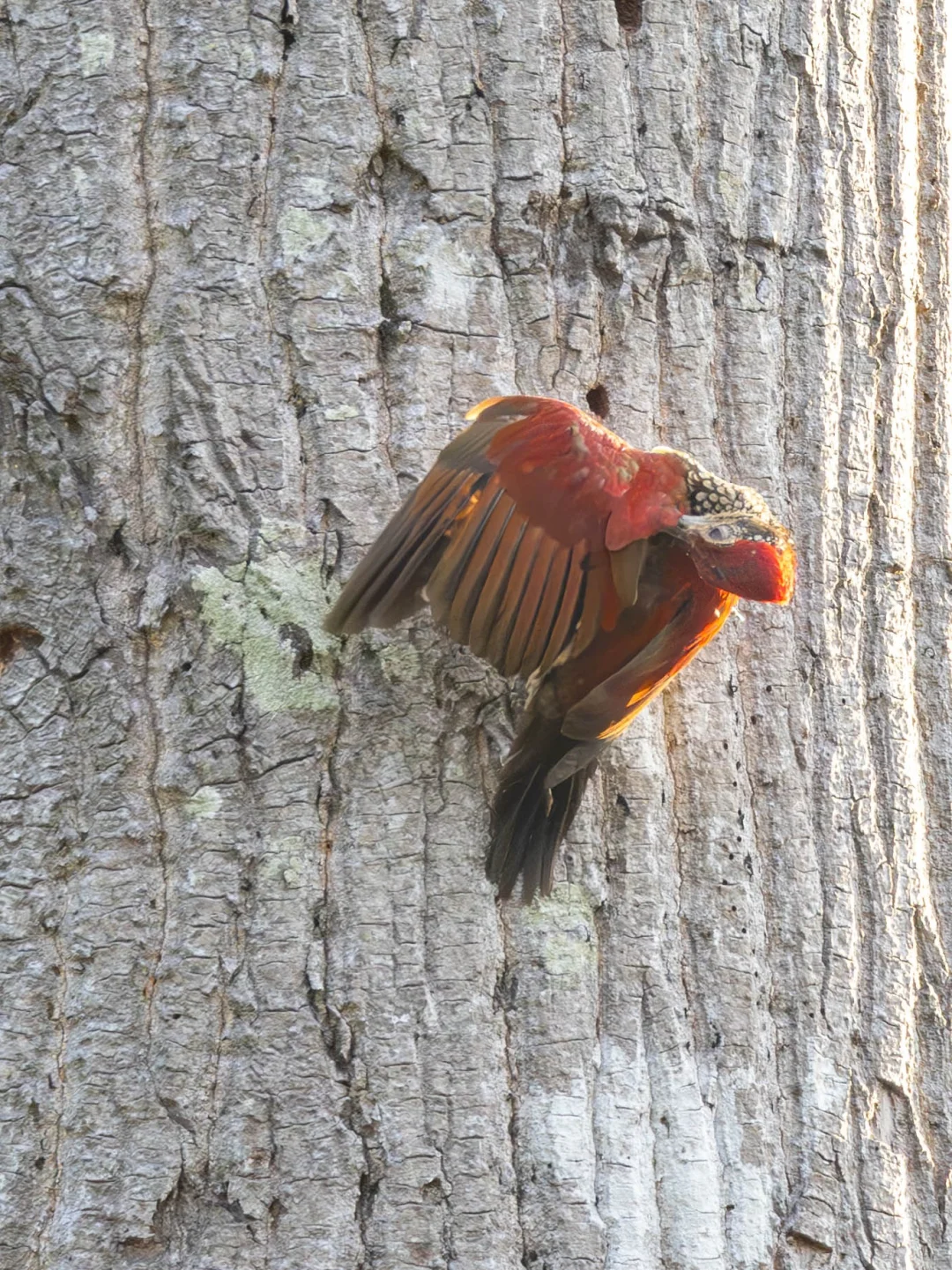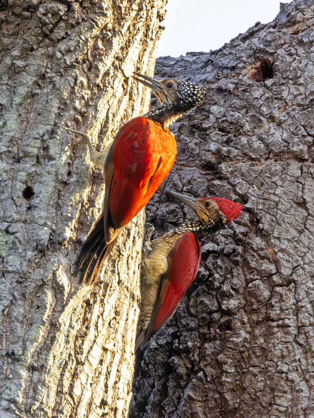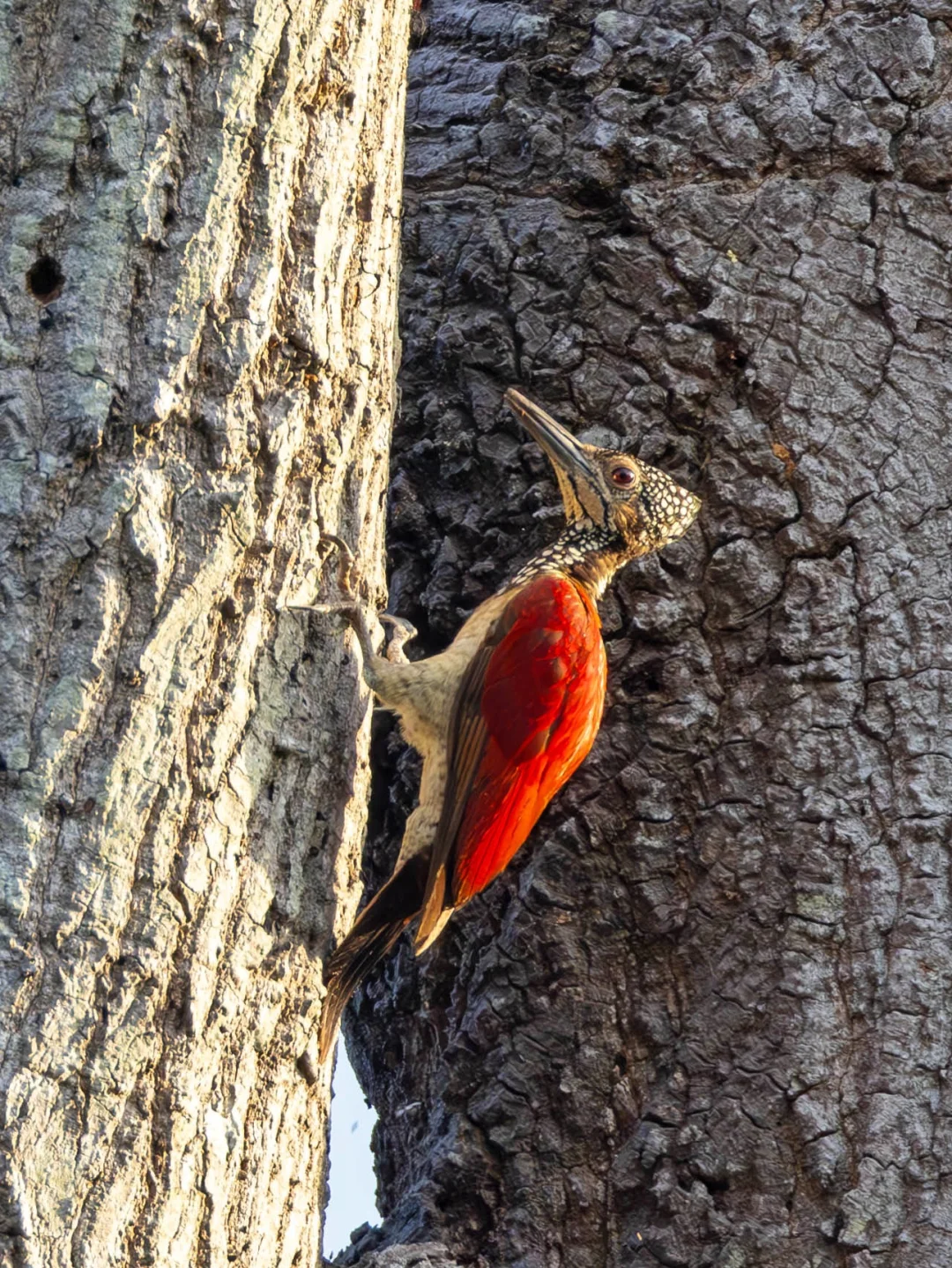 吕宋金背啄木鸟,虽然中文名字是金背,实际上以醒目的红色背部著称,而英文名字的flameback更是贴切地将其形容为烈焰背。这种啄木鸟雌雄颜色有些不同雄鸟的冠羽是红色的,而雌鸟是黑白斑点的头。