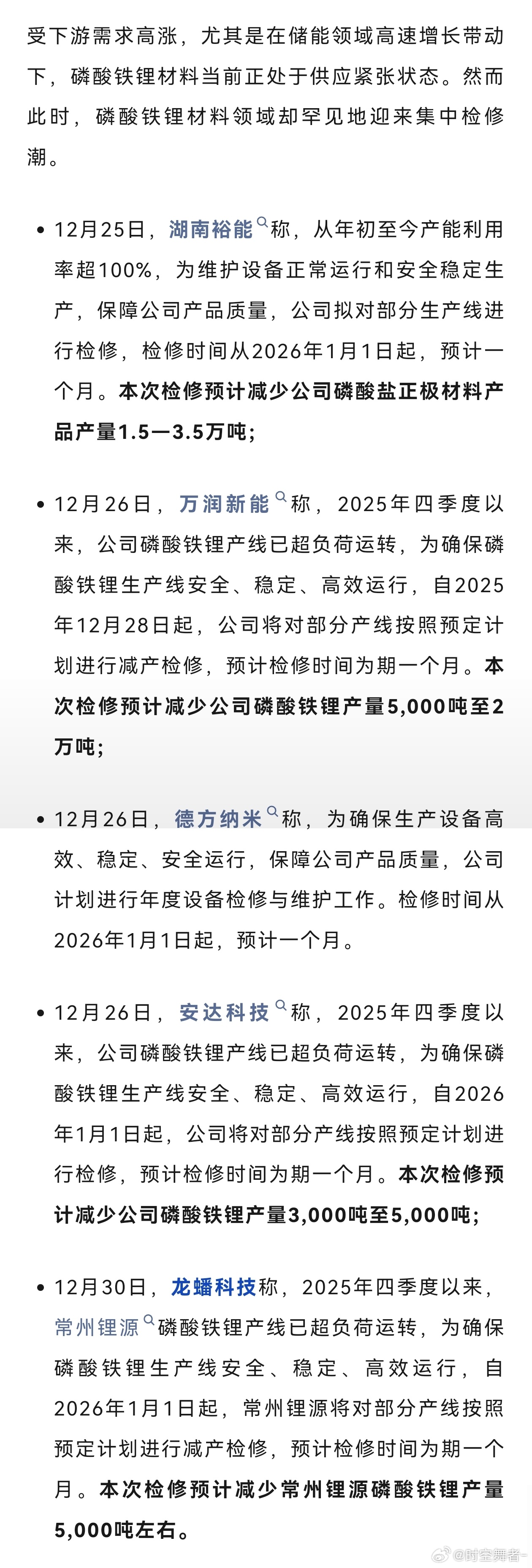 碳酸锂 据统计,以上5家企业市占率已经超过50%,这也就意味着占有半壁江山的磷酸铁锂企业加入检修队伍。期货