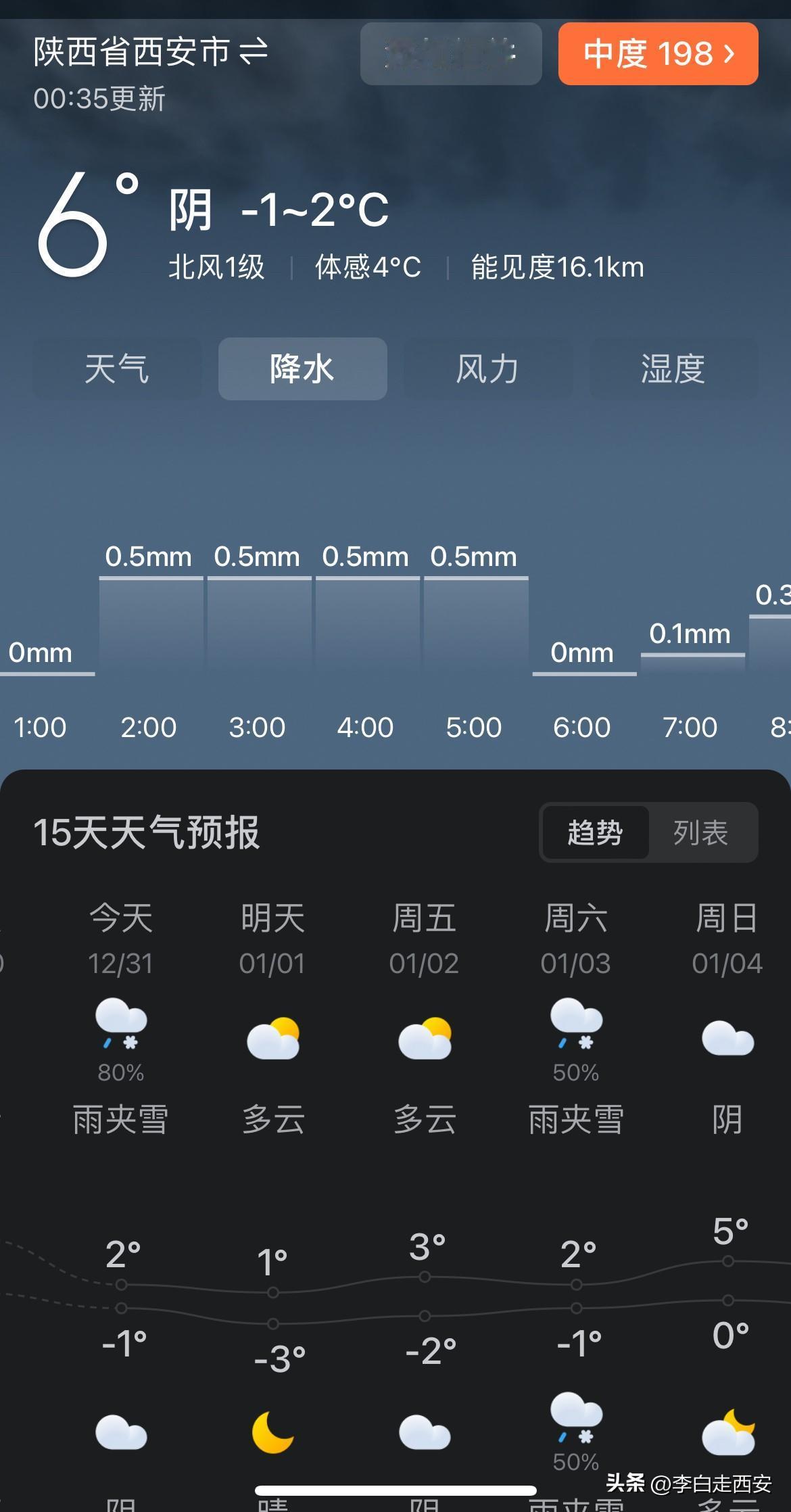 12月31日西安这场跨年之雪❄️ 不知道会不会如期而至, 进入12月份以来西安周边城市 都迎来了 今年的第一场雪, 可是这第一场雪却偏偏抛开西安城区, 甚至西安辖区的秦岭分水岭 都下了两场雪了。 天气预报显示12月31日西安市区 将有一轮雨夹雪天气过程, 预报甚至精确的测量出雨夹雪的降落 时间和雨量大小, 这场雪如果能及时降下 可谓是瑞雪兆新年了。 一张图记录元旦假期 元旦假期日记 西安第一场雨雪