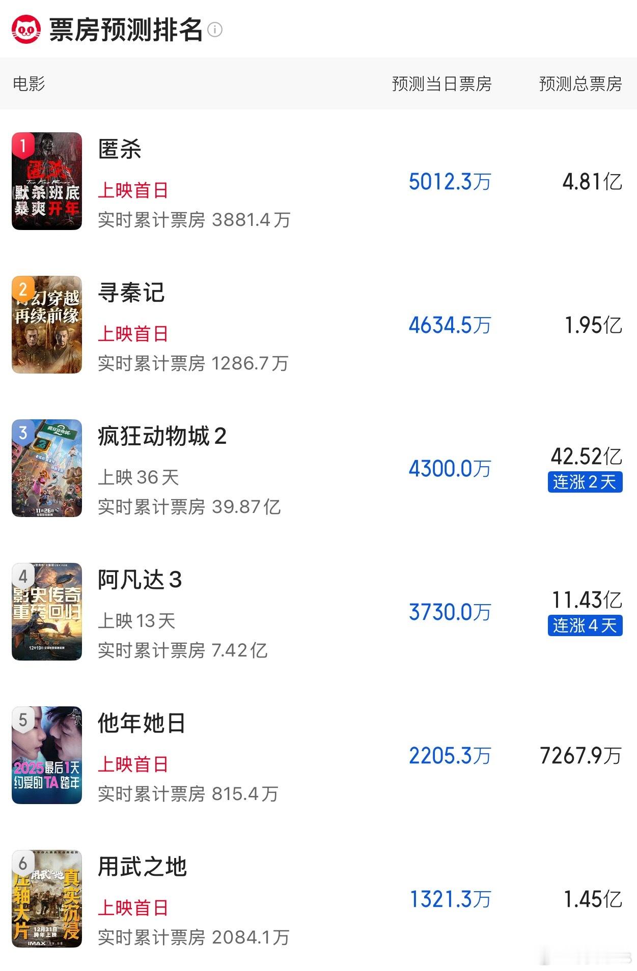 猫眼关于跨年档电影票房预测出炉《匿杀》4.81亿《寻秦记》1.95亿《他年她日》7267万《用武之地》1.45亿