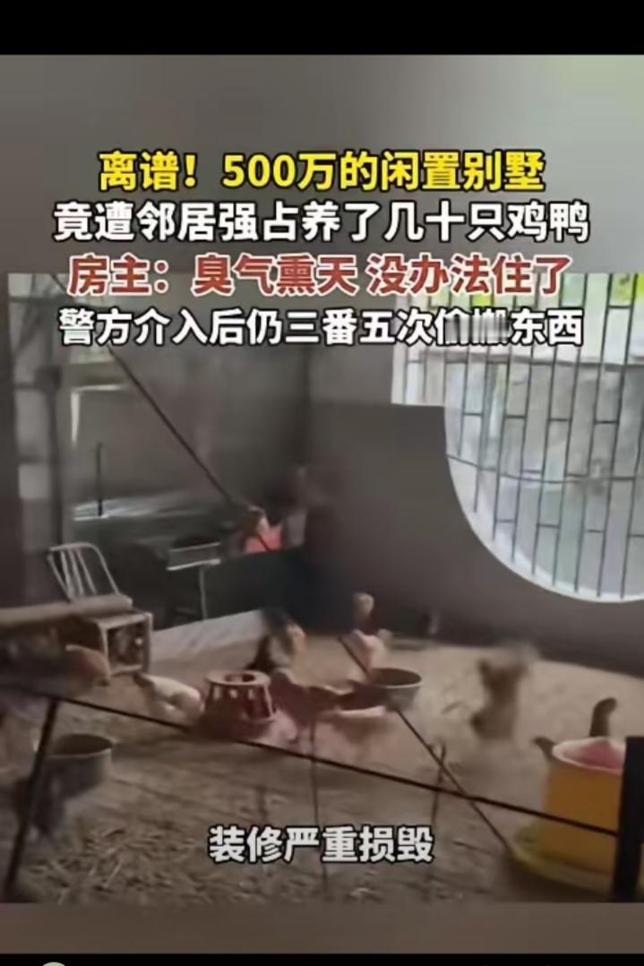 "脸都不要了!"福建一男子回老家祭祖,意外发现闲置多年的别墅里居然有动静,男子好奇,便慢慢向自家别墅靠近,可刚推开别墅门,就被一股恶臭气味熏得退了出来!原来,屋子已被邻居当成了鸡舍!气得男子直接报警!网友:邻居脸皮也太厚了! 祖籍福建的李先生最近做了一个梦,他梦见自己已故多年的父母在家里各自端着一碗白米饭,只吃饭却不没见着一点荤腥,正当李先生想上前询问原因时,父母却突然消失不见。 本来只是一个梦,不足为奇,但这勾起了李先生的一些回忆。他觉得自己已经好久没回乡祭祖了,于是次日一早就返回了福建老家。 李先生老家有一栋别墅,是十年前,他花了500多万专门给父母养老所建的,只不过后来二老病故,他又常年在外做生意,别墅就闲置了。 谁知,当李先生来到老家别墅跟前时,却依稀听到里面有些细微的动静,仔细一听,却听到了一些鸡鸭的叫声! 李先生很是纳闷,自己别墅早就没人住了,为什么里面有鸡鸭?一开始,李先生还以为是邻居家的几只鸡鸭不小心钻到自己别墅里了,但推门一看,一股恶臭将他逼退,捂紧鼻子再进去时,眼前的一幕让他脸色铁青! 原本干净整洁的屋子里,竟然变得狼藉不堪,屋子的各个角落竟然有几十只鸡鸭在里面闲庭信步,地上,沙发上到处都是这些家禽的粪便,根本就没有下脚的地方! 李先生怒不可遏,自己好好的别墅,竟然被别人当成了养家禽的地方!他当即就报了警。而民警也很快就查出了这些鸡鸭的归属,竟是李先生的邻居王某娥。 自知理亏,王某娥并没有做过多解释,而是默默将自己养在这里的鸡鸭转移了,但是地面的粪便和屋子里那些被弄坏的装饰,她置之不理。不仅如此,王某娥始终没跟李先生道过歉,甚至又在之后不久盗走了屋子里的一些还能用的家具。 李先生将自己的遭遇发到网上后,网友们议论纷纷。 这邻居王某娥真是奇葩中的奇葩,人家花500多万盖的养老别墅,不是给你当鸡舍鸭棚的地方啊!好好的精装房被霍霍得臭气熏天、一片狼藉,这哪是占便宜,简直是没脸没皮。 转移了鸡鸭就完事了,粪便不清理,损坏的装修不管不顾,甚至还顺手牵羊偷走家具,这操作真是刷新三观。占别人的便宜还理直气壮,连句道歉都没有,这脸皮厚得比城墙还宽。几百万的别墅用来养鸡鸭,纯属暴殄天物,也不知道她是怎么好意思做出这种事的。都说远亲不如近邻,摊上这种邻居,倒了八辈子霉。 各位读者你们怎么看?欢迎在评论区讨论。