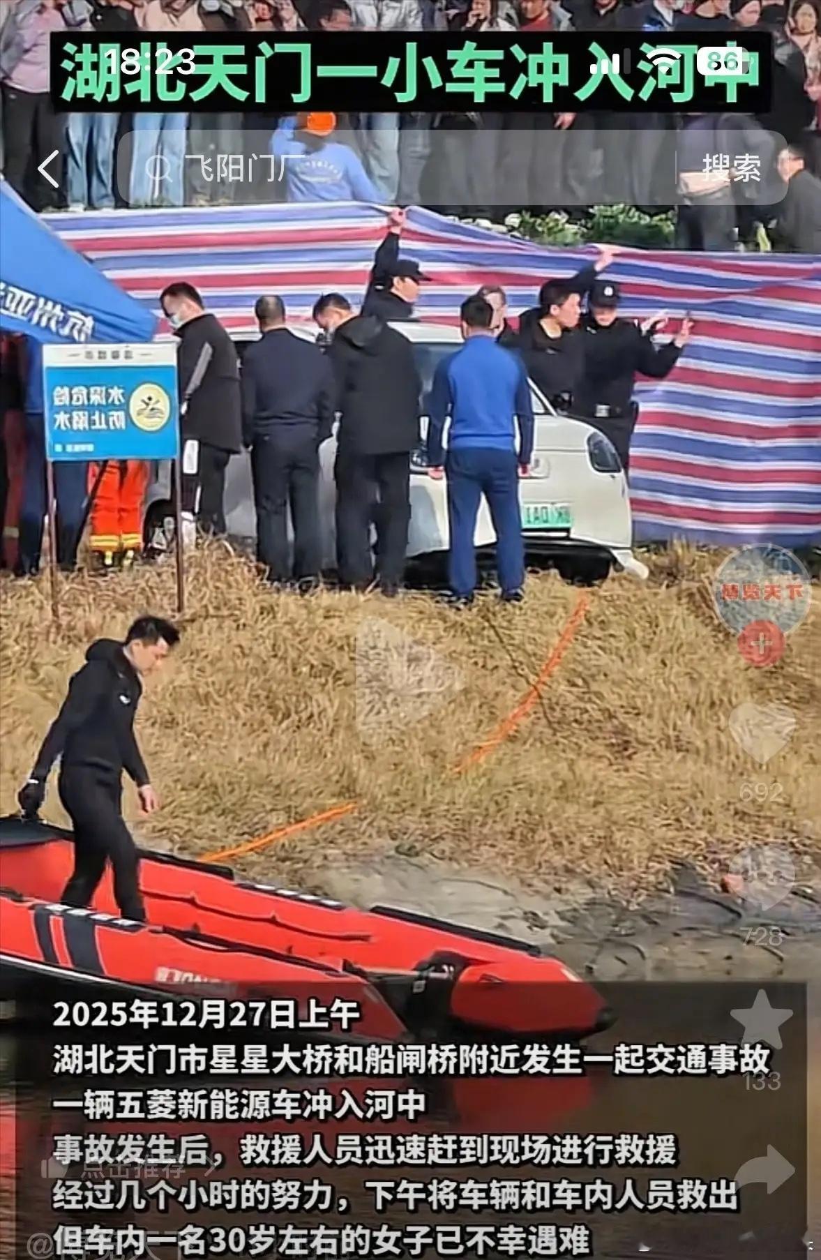 湖北天门,冲入河中的新能源女车主才26岁,她刚拿驾照不久,准备驾驶小车去上班的。没想到,还在半路上,人就出事了。那天是2025年12月27日,周六,清晨六点多,星星大桥和船闸桥附近还没什么动静。冬天的早上天亮得晚,路灯还亮着,路上车不多,河边更是安静,附近住的人大多还在睡觉,偶尔有早起的车经过,但整体来说,是一个再普通不过的周末清晨。就是在这样的时间和地点,一辆车从路面冲进了河里,消息传开后,很多人第一反应是“是不是车坏了”“是不是刹车失灵”,可随着现场情况被一点点还原,事情并没有那么简单。如果去过那个地方就会知道,那段路并不算危险,车道和河之间隔着一段距离,不是紧贴着水边的那种路。中间有绿化带,有草地,还有供行人走的步道,正常情况下,哪怕车子偏了一点,先碰到的也是路沿石,然后是草地,轮胎压上去,颠簸感、噪音都会很明显,驾驶员几乎不可能毫无察觉。可监控拍下来的画面却让人心里发紧,那辆车没有减速,也没有明显转向修正,像是直直地冲过去,越过绿化带和人行道,直接从护坡滑进河里。整个过程非常快,看不出任何试图补救的动作,这时候再回头看,就很难用“车失控”来解释了,更像是驾驶员在那一刻没能做出正确反应,甚至可能已经完全慌了。很多开车时间长的人都知道,一旦人在极度紧张的情况下,大脑反而容易“卡住”,平时练过无数遍的动作,关键时刻却怎么都想不起来。尤其是新手,对突发情况的心理准备几乎是空白的,一脚踩错踏板,或者踩住油门不敢松,这种事并不少见,现在的车动力来得快,一旦踩实,留给纠正的时间非常短。结合现场情况来看,那辆车一路往前冲,很可能就是在这种状态下发生的,不是没有刹车,而是没踩,或者根本没意识到自己该踩什么。后来了解到,这名女司机刚学完车不久,真正上路练习的时间只有一天左右,一天的练习,可能刚记住方向盘、油门和刹车的位置,但离“会开车”还差得很远。驾校里有教练提醒,路线固定,车速受控,和现实道路完全不是一回事,现实路况复杂得多,光线、环境、心理压力都会影响判断。很多人拿到驾照后,反而几年不敢独自开车,这并不是胆小,而是知道自己还没准备好。但这名司机显然对自己的能力判断过于乐观,在没有陪同、没有经验积累的情况下,选择独自上路,本身就存在风险。事故发生的时间也很不巧,清晨六点多,天还没亮,河边几乎没人,车子掉进河里后,没有第一时间被发现,也没人能立刻施救。等到下午两点多,打捞人员把车从水里打捞上来时,已经过去了很长时间,一切都来不及了。从路面到河里,其实有一段不短的距离,只要中间有一次冷静下来,松油门、踩刹车,结局都有可能不同,但现实就是,在那短短几秒里,恐慌占了上风。这起事故,说到底,技术只是表面原因,更深层的问题还是心态,新手上路,最缺的往往不是操作技巧,而是在突发状况下保持冷静的能力。如果当时副驾驶有人,哪怕只是提醒一句,或者帮忙干预一下,可能都能改变结果,但那天,副驾驶是空的。并不是每个人在任何时候都适合独立开车,这并不丢人,会不会开,和敢不敢开,其实是两回事。真正安全的驾驶,除了会踩踏板、打方向,还包括对自己状态的判断,心里没底、紧张、慌乱,本身就是危险信号。这起事故留下的教训其实很现实,每一次上车之前,都该想一想:自己现在的状态行不行,路况熟不熟,有没有应对突发情况的心理准备。如果答案是否定的,停下来并不是什么坏事。因为在车速和惯性面前,人能纠正错误的时间,真的只有那么一瞬间。