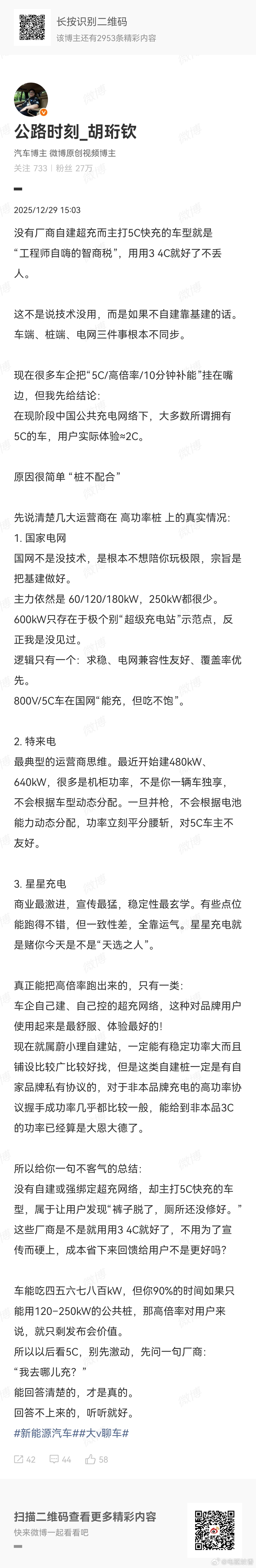 和 两位争论“没有自建桩的企业有没有必要用5C电池”。 一位觉得实际体验也就2C,不如用3C或者4C电池让利消费者; 另一位觉得5C的优势是在哪里充都快,都能充分利用桩端能力,这里的桩端包括了各种充电桩。作为理想超充桩的忠实用户,我是明确能感受到自营和三方的区别的,自营桩理想MEGA能轻松拉到500kw功率而三方超充桩(包括华子600kw桩)基本也就200到300之间。我个人的结论就是:没有自建桩的5C是瘸腿的,体验是“虚假”的。