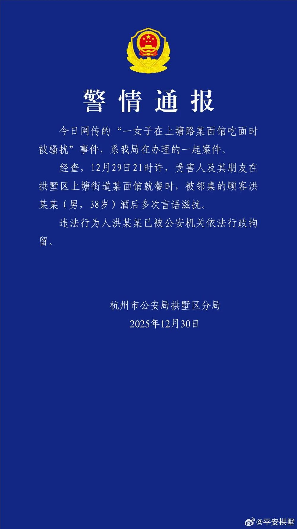 12月30日,杭州市公安局拱墅区分局针对“一女子在面馆吃面被骚扰”事件发布警情通报,违法行为人洪某某(男,38岁)已被公安机关依法行政拘留。