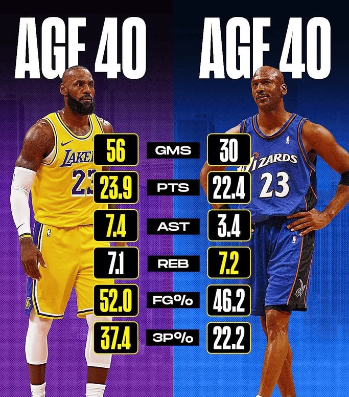 美媒《Clutchpoints》在官方社媒上晒出了一组数据,对比了勒布朗-詹姆斯与迈克尔-乔丹40岁时的比赛数据,详情如图所示。 配文称:“这就是两大历史最佳(原文:the two GOATs),勒布朗-詹姆斯与迈克尔-乔丹,在 40 岁时的实力数据对比。 NBA 历史上所有人都将 “40 岁门槛” 视作生涯终点,乔丹与勒布朗却把它活成了生涯第二春,依旧保持着高效输出,这样的赛场表现,在联盟历史上至今无人能复刻。 二人都证明,真正的伟大从无保质期,而勒布朗如今仍在续写传奇。”