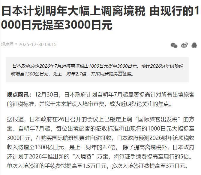 就在刚刚,日本政府宣布了! 12月30日,日本政府宣布从明年7月起,所有坐飞机或轮船离开日本的人,都要多交一笔钱,这叫“离境税”。 这次的离境税不是新税种,而是在现有基础上的大幅涨价。目前日本对每位出境旅客征收的“国际观光旅客税”是1000日元,换算成人民币大概45块钱,很多人在买机票时自动扣除,可能都没太留意。 但从2026年7月开始,这笔钱会直接涨到3000日元,也就是约135元人民币,整整涨了两倍。 而且不只是外国游客要交,日本本国人出国也得掏这笔钱,只要是坐飞机或轮船离境,一个都跑不了,收费会直接整合到机票或船票里自动扣除,不用额外去税务局申报缴纳。 可能有人会问,日本政府为啥突然要涨这笔钱?表面理由说得冠冕堂皇,说是要把这笔钱用在改善旅游基础设施、开发地方旅游资源上,还提到要缓解热门城市的“过度旅游”问题,比如京都、奈良这些地方,游客太多导致交通拥堵、垃圾堆积,当地居民意见很大。 但只要稍微挖深一点就会发现,核心原因其实是日本的财政快扛不住了。根据权威媒体报道,日本现在的国债总额已经达到了GDP的两倍,2026财年还计划推出史上规模最大的财政预算,其中社保支出和国防开支都在大幅增加,缺口只能靠发债和增税来填补。 可在日本,给国内民众加税是件风险极高的事,尤其是临近参议院选举,各个政党都怕惹选民不满,所以就把主意打到了“不容易得罪人”的游客身上,毕竟外国游客没有投票权,而本国民众的不满也能被“改善旅游环境”的理由暂时安抚。 日本政府打得一手“如意算盘”,觉得这样能轻松多收钱。按照他们的预测,涨价后2026财年的离境税收入能达到1300亿日元,是上一财年的2.7倍。 而且这种税征收起来特别方便,不用新增任何征收流程,直接让航空公司和船公司帮忙代收就行,管理成本极低。 但他们似乎没考虑到,这种“饮鸩止渴”的办法,很可能会砸了自己的旅游招牌。要知道,2024年访日外国游客已经达到3687万人次,创下历史新高,其中中国游客占比超过五分之一,这些游客的消费撑起了日本旅游业的半壁江山,2023年外国游客在日消费总额都突破8万亿日元了。 现在突然涨价,再加上日本还计划把签证费也涨五倍——单次签证从3000日元涨到1.5万日元,多次签证涨到3万日元,这对游客来说就是“双重打击”。 有记者在日本街头采访时,不少外国游客都表示难以接受,一位美国游客直言“多交4000日元的话也太贵了”,而日本本地的商家更是忧心忡忡。 东京浅草寺附近一位卖鲷鱼烧的店主就说,自己店里七八成的顾客都是外国人,要是游客因为涨价变少,生意可能都撑不下去。 其实这种担忧不是没道理,英国就有过前车之鉴,2021年英国取消对外国游客的免税政策后,奢侈品商店销售额直线下降,高消费游客全跑到了巴黎、米兰。 现在日本周边的竞争对手也在虎视眈眈,韩国2025年9月已经对中国团体游客开放免签,还准备扩大到个人游客;越南把电子签证延长到90天,专门吸引预算型游客。日本在涨价的同时不提升服务质量,反而增加游客成本,很可能让这些游客转而选择其他国家。 而且这个政策连日本本国人都不买账。很多日本人质疑,要是这笔钱真的是用来改善旅游基础设施,为啥要让本国人也一起买单?自己出国还要为外国游客带来的“过度旅游”问题交钱,这实在说不通。 早稻田大学的教授也分析,长期来看,涨价可能会抑制日本人的出境意愿,慢慢导致国民国际化视野萎缩,甚至削弱日本企业的国际竞争力。 说到底,日本政府的这个政策,本质上就是“拆东墙补西墙”,想靠牺牲旅游业的长远发展来填补短期的财政窟窿。他们只看到了眼前能多收的几百亿日元,却忘了旅游业的核心竞争力在于性价比和友好度。 对于计划去日本旅游的中国游客来说,影响也是实实在在的。现在去日本旅游,机票、酒店价格本来就因为日元贬值和游客增多而上涨,再加上新增的135元离境税和上涨的签证费,一趟旅行的成本会明显增加。 尤其是现在中国游客的消费习惯已经从“爆买”变成了“体验式深度游”,更看重旅游的性价比和舒适度,要是日本只涨价不提升服务,比如景点还是人挤人、公共厕所和垃圾桶依然稀少、交通指引还是混乱,很多人可能会重新考虑旅行计划。 其实要解决“过度旅游”和财政问题,日本有更合理的办法,比如推行景点预约制、分时段参观,优化公共交通调度,把旅游资源向非热门城市分流,而不是简单粗暴地涨价。 现在这种“一刀切”的增税方式,短期可能能缓解财政压力,但长期来看,只会透支日本旅游业多年积累的口碑,让自己在亚洲旅游市场的竞争力越来越弱。毕竟游客的选择很多,谁也不愿意花钱买不舒服的体验。 参考来源:日本计划明年大幅提高“离境税”——财联社2025-12-30