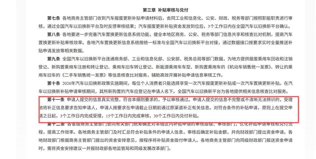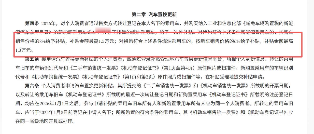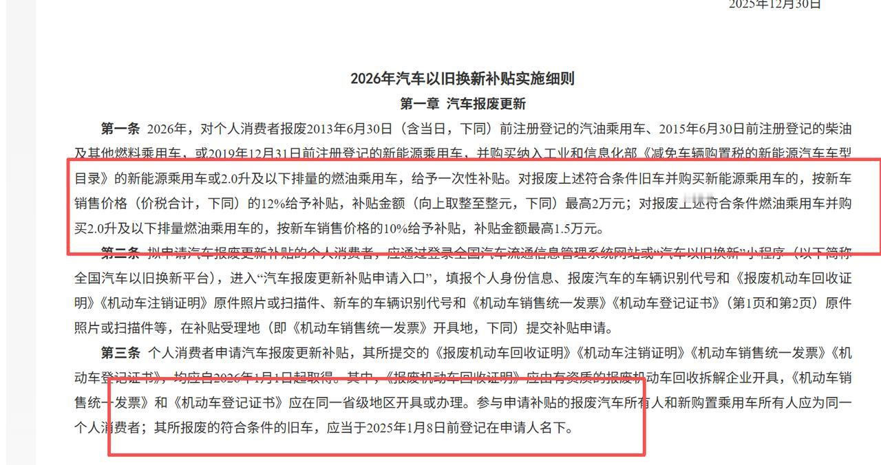 2026年“国补”政策来了,汽车以旧换新补贴实施细则出炉,具体如下。 补贴对象与条件: -报废的符合条件的旧车,应当于2025年1月8日前登记在申请人名下。 -若参与申领补贴的报废旧车为汽油乘用车,则其注册登记时间应在2013年6月30日(含当日)之前。 -若参与申领补贴的报废旧车为柴油及其他燃料乘用车,则其注册登记时间应在2015年6月30日(含当日)之前。 -若参与申领补贴的报废旧车为新能源乘用车,则其注册登记时间应在2019年12月31日之前。 补贴标准: -报废更新:购买新能源车补贴12%(最高2万元),燃油车补贴10%(最高1.5万元)。 -置换更新:购买新能源车补贴8%(最高1.5万元),燃油车补贴6%(最高1.3万元)。 相比2025年进一步扩大支持范围,对符合条件的补贴申请,30个工作日内兑付补贴。【来自懂车帝车友圈】