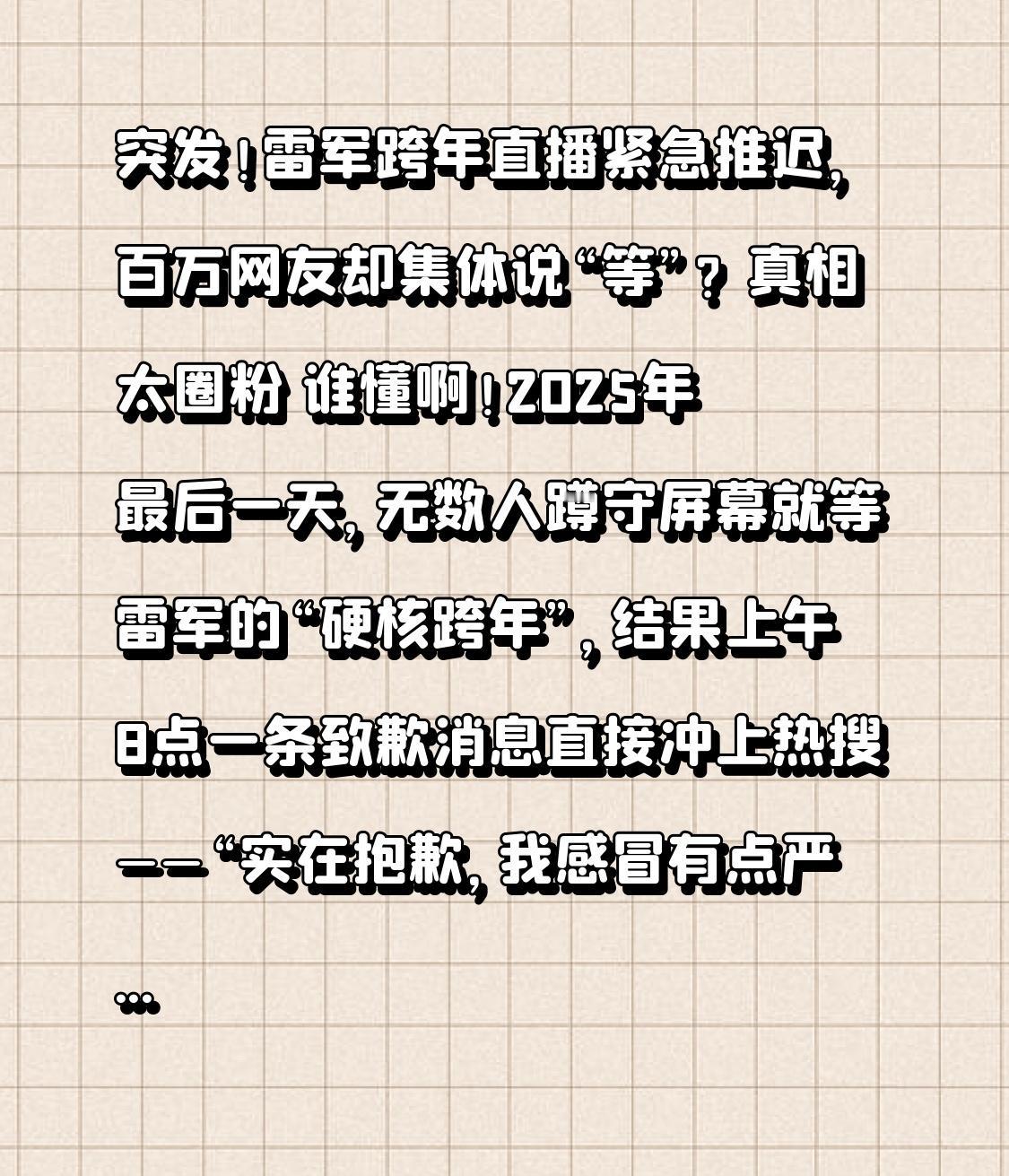 突发!雷军跨年直播紧急推迟,百万网友却集体说“等”?真相太圈粉 谁懂啊!2025年最后一天,无数人蹲守屏幕就等雷军的“硬核跨年”,结果上午8点一条致歉消息直接冲上热搜——“实在抱歉,我感冒有点严重,原定跨年直播推迟到1月3日晚7点” ! 要知道这可不是普通的跨年直播啊!前一天雷军刚官宣时,全网直接沸腾了。别人跨年搞歌舞煽情,他偏要剑走偏锋:请工程师现场拆小米YU7,从车身钢材到电池防护,边拆边聊2025的高光与2026的展望。之前SU7拆解视频刷屏时,网友就齐刷刷喊话“求拆YU7”,这次雷军直接“听劝”安排,还承诺揭秘那些第三方没拆到的隐藏细节,比如74.4%铝合金覆盖率的防撞梁、2200兆帕的超强钢A柱,堪称汽车圈的“透明公开课”。 打工人早就调好闹钟,准备一边跨年一边学干货;车迷们列好了问题清单,就等问底盘调校和热管理系统;米粉更是期待看到小米2025年的成绩单——SU7交付量稳居新势力前列,17Ultra站稳高端市场,“手机+汽车”生态越来越扎实。谁能想到,距离直播不到12小时,突然迎来推迟的转折。 一开始评论区还有点小遗憾,有人调侃“雷总终究没躲过年底流感”,也有人担心“拆车内容会不会缩水”。但看清原因后,画风瞬间反转:“身体要紧,不差这三天”“感冒了还想着提前通知,这份真诚太难得”“只要能看到真实拆解,多等几天完全ok”。 其实大家愿意等,不只是因为拆车干货足,更因为雷军的实在。比起那些藏着掖着的宣传,他敢把汽车拆成零件给大众看,这份对产品的自信本身就圈粉;比起敷衍的通知,他亲自致歉、明确新时间,这份责任感更让人认可。 想想我们期待的从来不是一场普通直播,而是成年人世界里的“双向奔赴”:我们想看真诚不套路的分享,想看国货品牌的硬核实力,想看努力者被温柔以待。雷军说要聊2025的难忘瞬间,其实这一年我们每个人都在坚守——为生活打拼,为热爱坚持,为国货崛起喝彩。 1月3日晚7点,等雷军康复归来,等那场迟来的硬核拆解,也等和所有努力的人一起,带着2025的遗憾与收获,奔赴更值得期待的2026。你最想在直播里看到YU7的哪个细节?评论区聊聊~