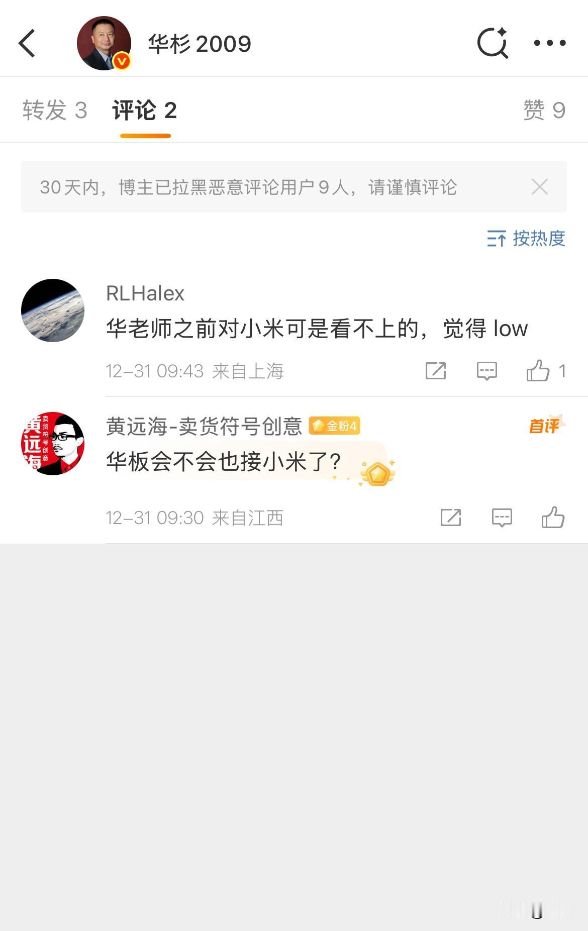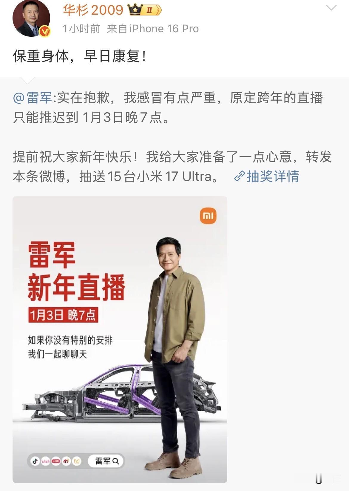 华与华关心雷军的健康[捂脸] 今天早上,雷军在社交网络说自己感冒了,能够准时开展今天晚上的直播活动了,大家都在他的留言,向他表示,要好好的休息。 其中最让人看不懂的就是华与华,不知道他们私底下是不是有业务往来,他突然表示出对雷军的关心,给他留言,让他保重身体早日康复。 人家又不是什么大问题,只是一个普通的感冒,他说早日康复这种话吗,所以有人就怀疑,他是不是想借助雷军的流量,来引起大家的注意,于是有人在评论区问候华与华,现在有人留言说,他们曾经好像不是怎么看得起小米的[捂脸] 所以现在他表现出的这种关心,多多少少会让你觉得,他是不是不是那么单纯的,仅仅只是想表达出关心[看],毕竟这段时间 他与罗永浩之间的纠缠,还没有完全理清楚,现在又来突然来了兴趣关心亿万富翁[捂脸]