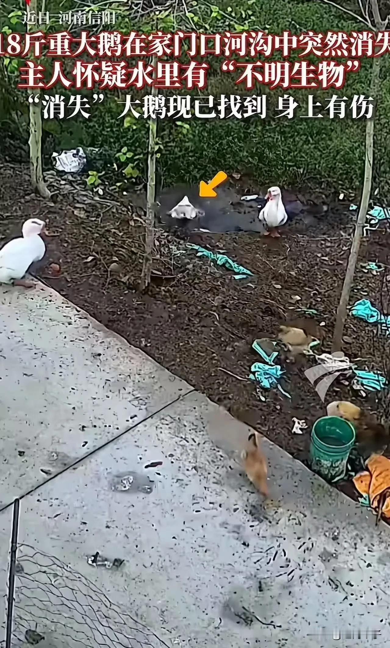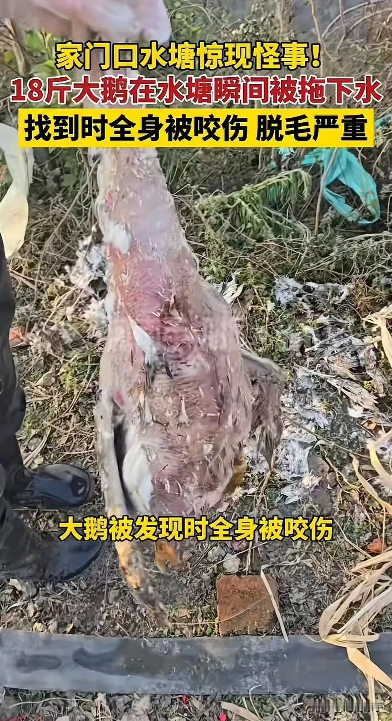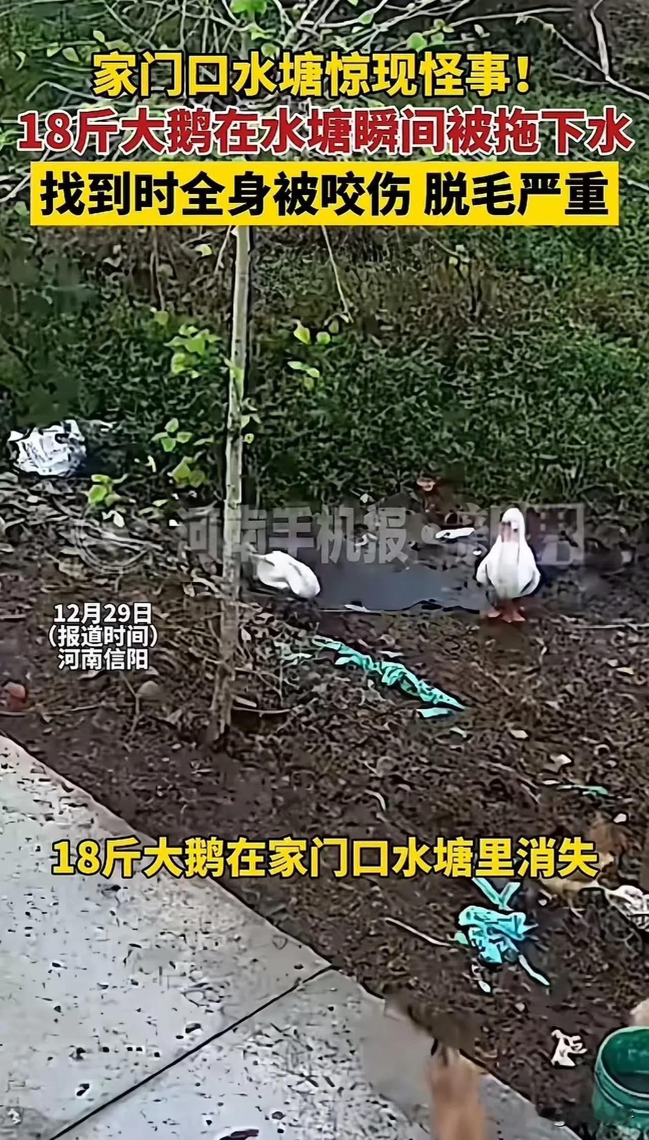 河南信阳水塘怪事!监控拍下曹先生18斤大鹅被水下不明力量拖走,抽干水找到失踪大鹅,浑身伤口羽毛脱落,塘底翻了个遍,连根“凶手”的毛都没看见。网友吵翻了天,这事儿到底咋回事? 河南信阳一处乡村的水塘被彻底抽干,村民曹先生丢失的大鹅终于被找到,大鹅身上布满伤口,水塘里没发现任何可疑生物的踪迹,这件发生在村口的怪事,非但没迎来结局,反而变得更加让人捉摸不透。 这个地处豫南的普通村落里,水塘是村里常见的景观,这片水域最深的地方能达到两三米,水面常年被茂密的水草覆盖,水色浑浊,平时很少有人会特意关注这片看起来平平无奇的地方。 曹先生住在水塘附近,家里养着一群大鹅,这些大鹅生性泼辣,白天会自己踱着步子到野外觅食,傍晚再慢悠悠地回窝,基本不用曹先生费心思看管。日子就这么不紧不慢地过着,曹先生像往常一样去清点鹅群,平静被彻底打破。 他站在鹅圈边数了一遍又一遍,确定少了一只体重足有18斤的大鹅。那只大鹅是鹅群里的壮硕个体,平时很少掉队,曹先生第一时间想到的就是被人偷走了。他越想越生气,转身就往家里跑,要去调取门口的监控录像,非要把那个偷鹅的人揪出来不可。 监控录像清晰地记录下了大鹅失踪前的最后画面。屏幕上,那只大鹅优哉游哉地走到水塘边,扑棱着翅膀跳进水里,还没等它在水面上浮稳,就像是被什么东西猛地拽了一下,整个身体瞬间被拉入水中,连一点水花溅起的痕迹都没有留下。画面定格在大鹅消失的那一秒,曹先生盯着屏幕,惊得半天说不出话来。 他心里又惊又怕,那片水塘看着不起眼,水下情况却复杂得很,茂密的水草交织在一起,谁也不知道底下藏着什么。他心里的好奇心压不住,到底是什么东西,能有这么大的力气,悄无声息就把一只十几斤的大鹅拖下水?曹先生把这段监控和自己的疑惑发到了网上,想让网友们帮着分析分析。 帖子发出去没多久,评论区就炸开了锅。网友们的好奇心比曹先生还要旺盛,一条条留言涌进来,都在催促他把水塘的水抽干,看看水下到底藏着什么秘密。 曹先生本就憋着一股劲要弄个明白,网友的提议坚定了他的想法。他立刻行动起来,挨家挨户去村里借水泵,忙活了大半天,总算凑齐了够用的设备。 村里好几户人家都反映,最近家里也丢了大鹅,失踪的大鹅,最后出现的地点都离这片水塘不远。这个消息让曹先生更加确定,水塘里肯定藏着不为人知的东西,那些丢失的大鹅,多半都和这片水域脱不了干系。 他带着借来的水泵赶到水塘边,麻利地接好水管,启动了设备。水泵嗡嗡作响,浑浊的塘水顺着水管源源不断地被抽出来,水塘的水位一点点下降,原本被水草覆盖的塘底逐渐露出真容。曹先生和几个看热闹的村民守在塘边,眼睛一眨不眨地盯着水面,生怕错过任何一点线索。 水位越来越低,塘底的淤泥和石块都露了出来。有人在一片淤泥里发现了一团白色的东西,走近一看,正是曹先生丢失的那只大鹅。眼前的景象,让所有人都倒吸了一口凉气。大鹅的身体僵硬,身上有四五处明显的伤口,羽毛脱落得七零八落,看起来像是经历过一场激烈的挣扎。 村民们在水塘的其他角落,陆续发现了几只大鹅的残骸,那些残骸都只剩下了白森森的骨架,连一点皮肉都没有留下。 曹先生蹲在塘边,看着这些残缺的尸体,心里的疑团越来越重。他和村民们一起,把整个水塘翻了个底朝天,水草底下、淤泥深处都找了个遍,没发现任何可疑生物的影子。 如果是水下的生物捕食了大鹅,不会不把尸体吃掉。要是大鹅是自己不小心陷入淤泥淹死的,身上不会有这么多伤口。这些问题在曹先生的脑子里打转,他怎么想都想不通。 这件事很快就在村里传开了,也在网上引发了热烈的讨论。有网友说,大概率是黑鱼干的,自己曾经亲眼见过黑鱼捕食野鸭的场景,那凶猛的劲头,对付一只大鹅不成问题。 也有网友提出反对意见,18斤的大鹅体型不小,黑鱼根本没有那么大的力气能把它瞬间拖下水,应该是鳄雀鳝,这种鱼生性凶猛,而且攻击力极强。还有人猜测是鳄龟,鳄龟喜欢藏在淤泥里,就算把水塘抽干,也很难发现它的踪迹。 对此,你怎么看?