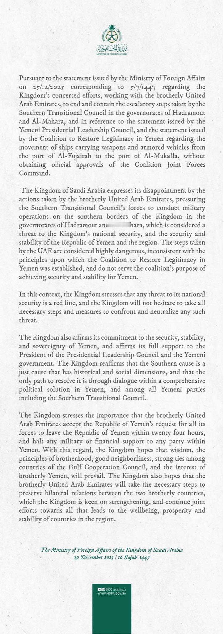 重大消息:沙特指责阿联酋在也门东部采取了危险行动,称这些行动威胁到了沙特的国家安全,并警告称将对任何越界行为作出回应。利雅得呼吁阿联酋在 24 小时内从也门撤出所有部队,并停止对也门各派别的军事及财政支持,同时重申支持也门的统一以及通过政治途径解决问题。海外新鲜事何天恩