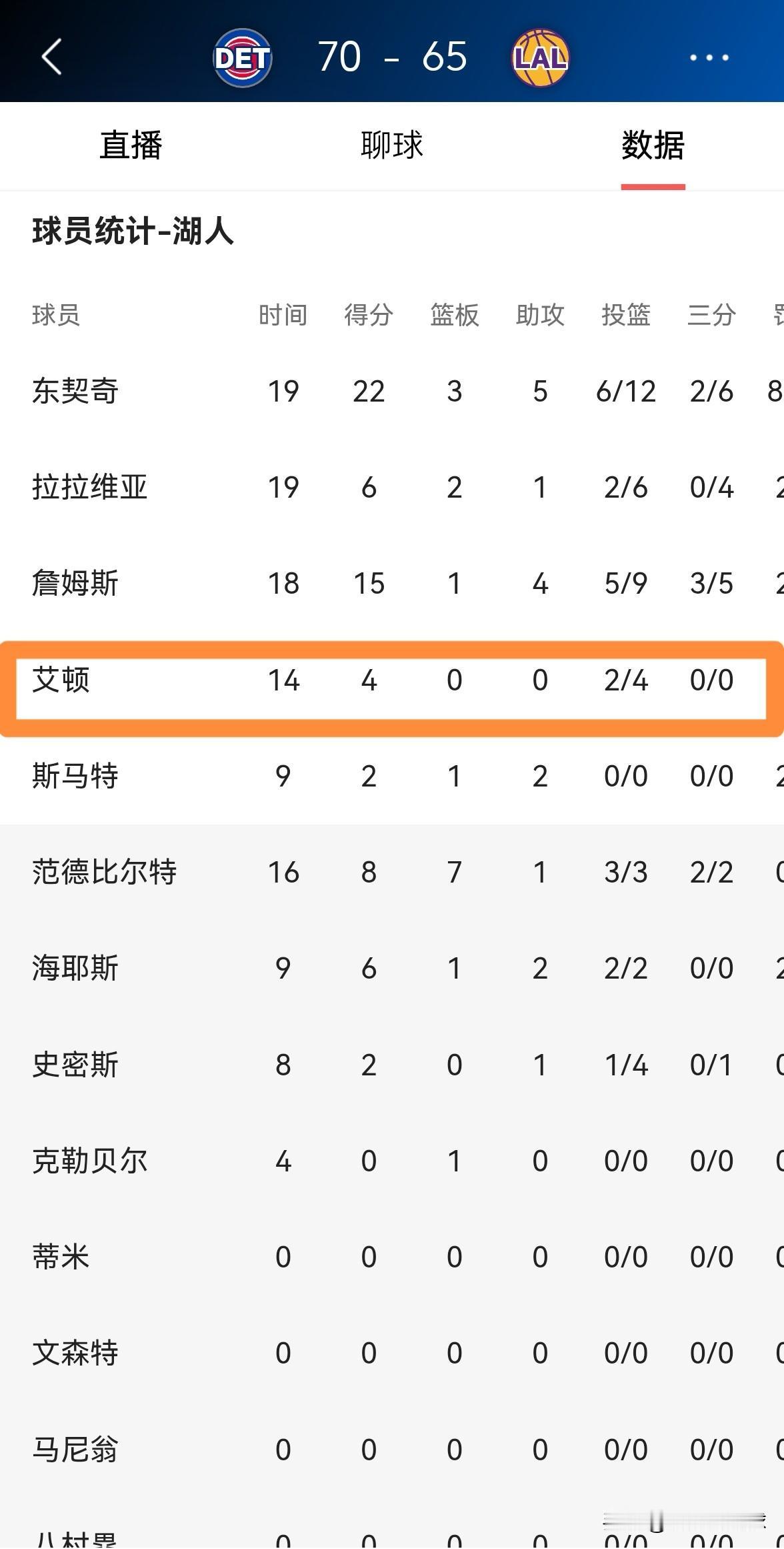我强烈建议湖人立刻交易走中锋艾顿!在今天进行的湖人和活塞的比赛中,目前双方的上半场比赛已经结束,湖人以65:70落后于对手。值得注意的是,在前两节比赛中,艾顿首发出战14分钟,投篮4中2得到4分,他的场上正负值为-4。 艾顿最让人感到失望的地方在于,身为一名中锋,他竟然在14分钟的上场时间里没有抢到1个篮板。试问像这样的中锋留之何用?