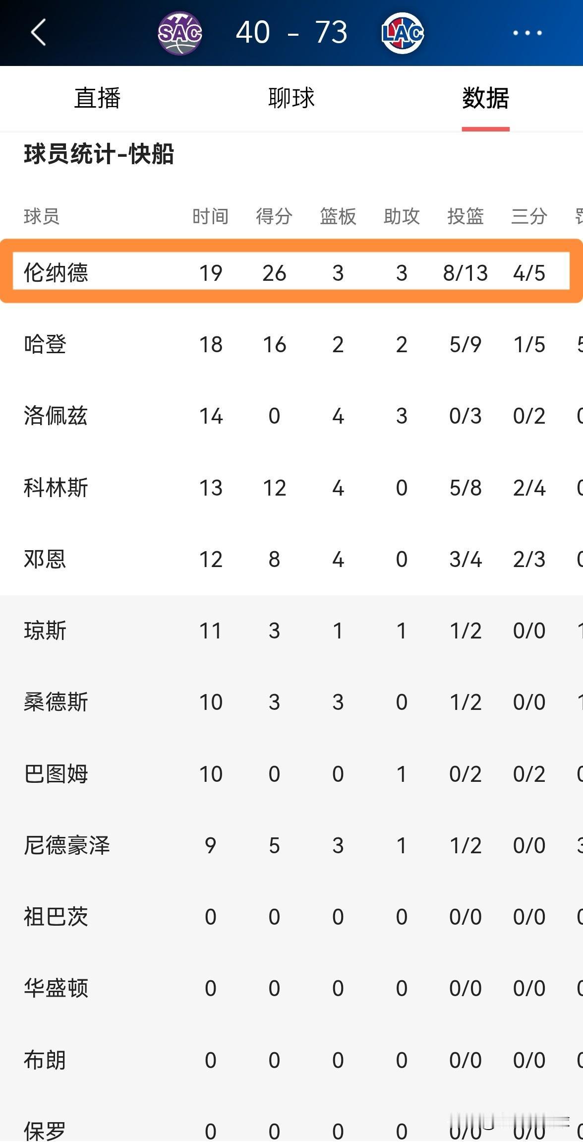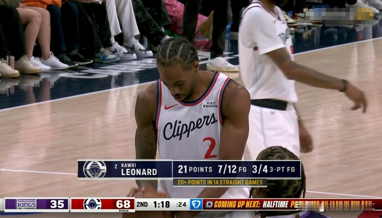 快船超级巨星伦纳德真是太过分了!在今天快船主场迎战国王的上半场比赛中,伦纳德面对实力较弱的国王大开杀戒,他在首发出战的19分钟里,投篮13中8,其中三分球5中4、罚球7中6爆砍26分,还有3篮板3助攻1抢断,没有出现任何的失误,他的场上正负值为全队最高的+26,带领球队以73:40领先对手结束了前两节的比赛。