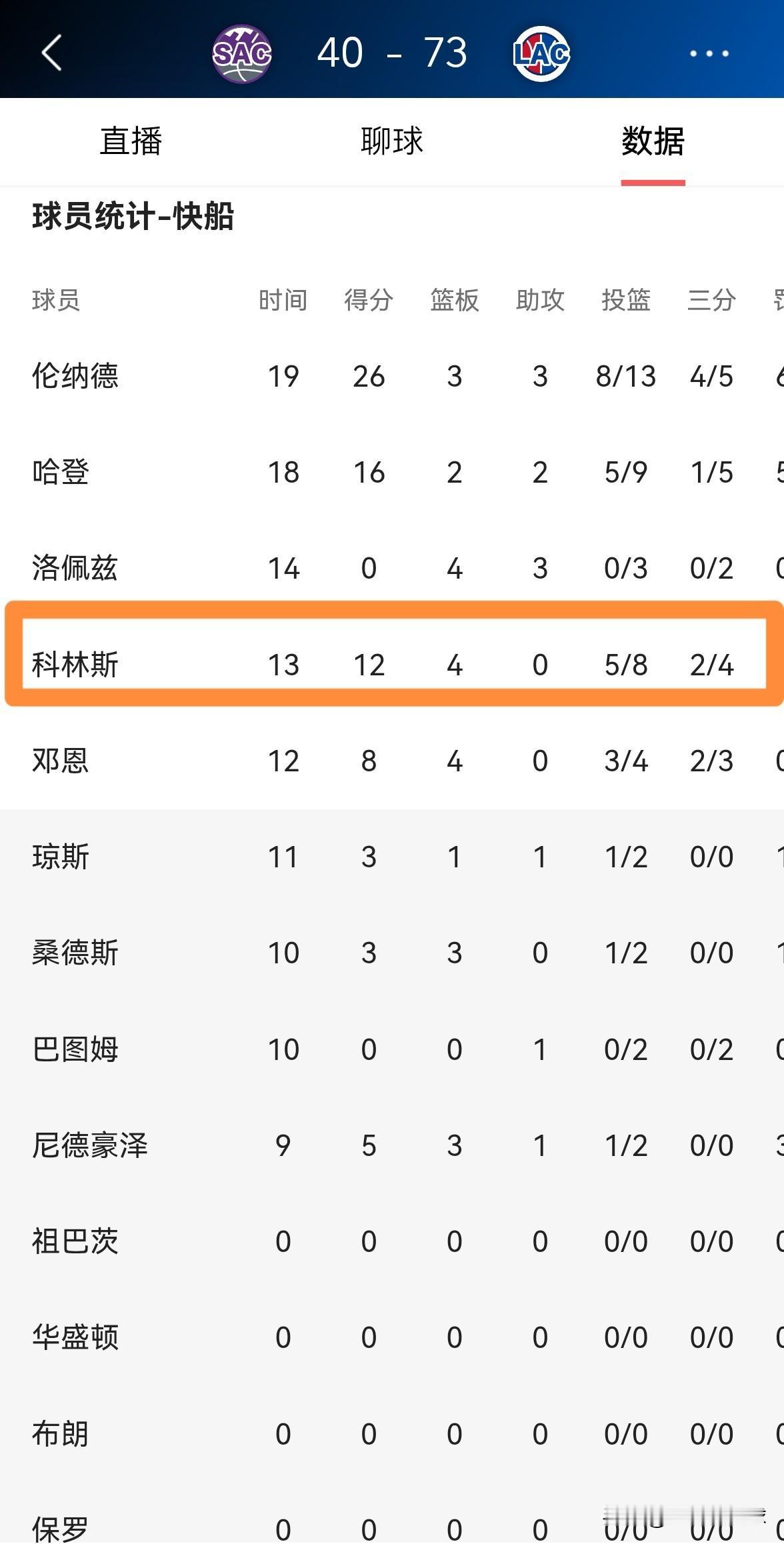 我一定要怒赞快船大将科林斯!在今天快船主场迎战国王的上半场比赛中,伤愈复出的科林斯在攻防两端都打出了非常亮眼的表现,帮助球队以73:40领先对手结束了前两节的比赛。 在前两节比赛中,科林斯首发出战13分钟,投篮8中5,其中三分球4中2非常高效的砍下12分4篮板1抢断2盖帽,他的场上正负值为+20。 毫不夸张的说,如果科林斯能够在接下来的比赛中延续这样的出色表现,快船怎么会舍得交易他?