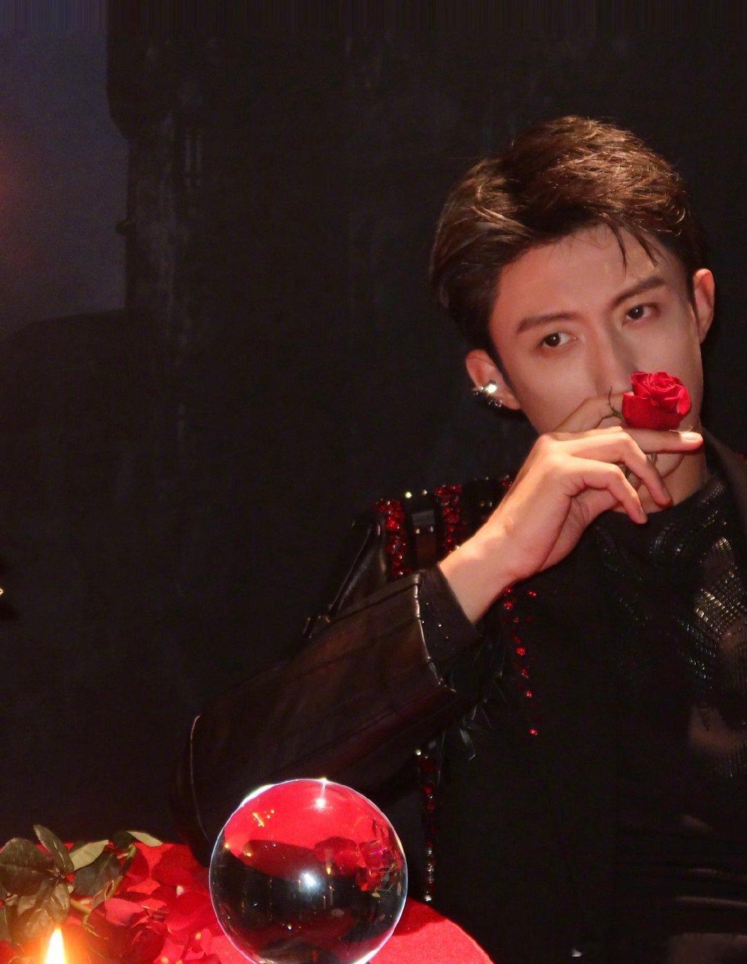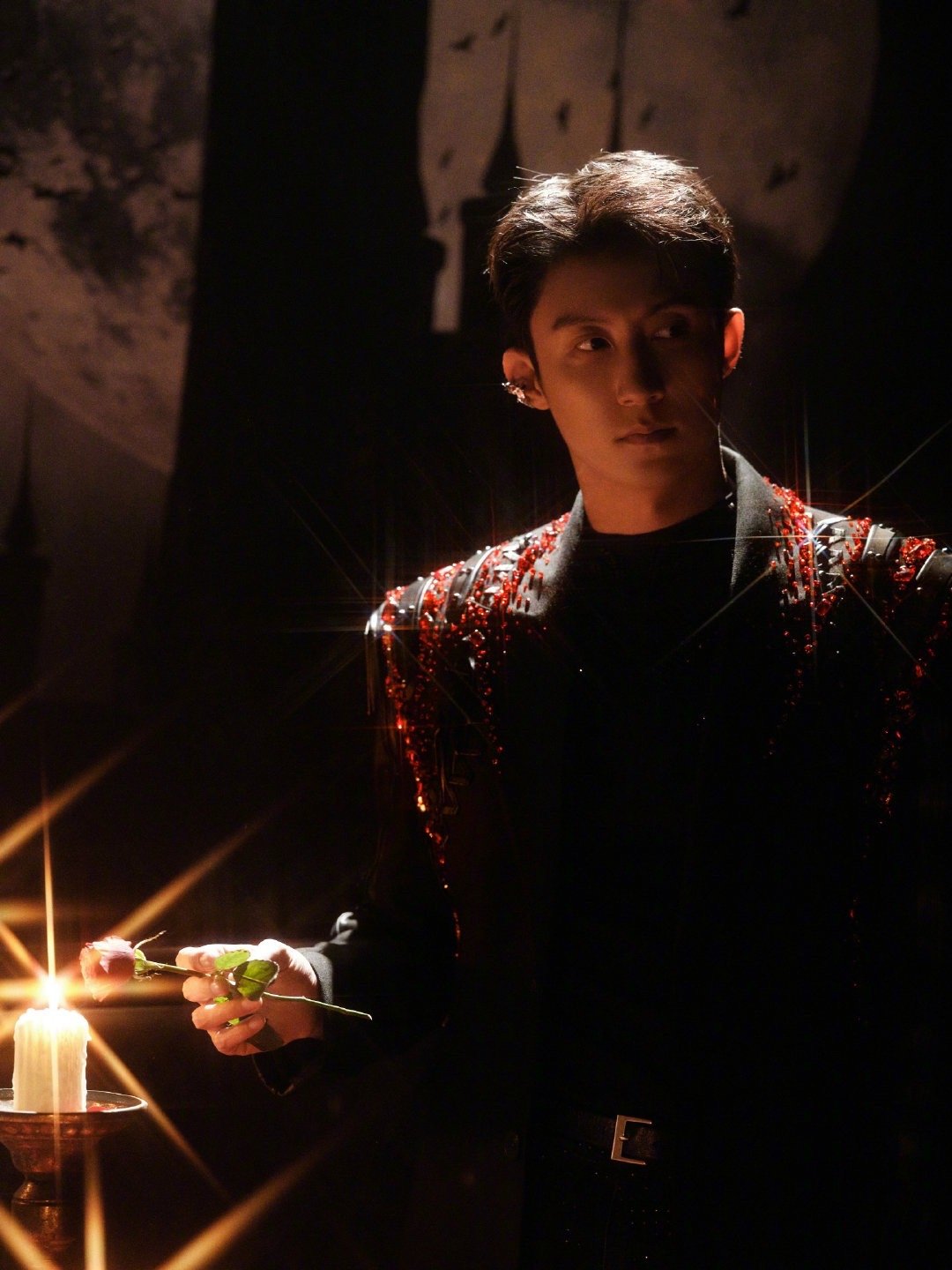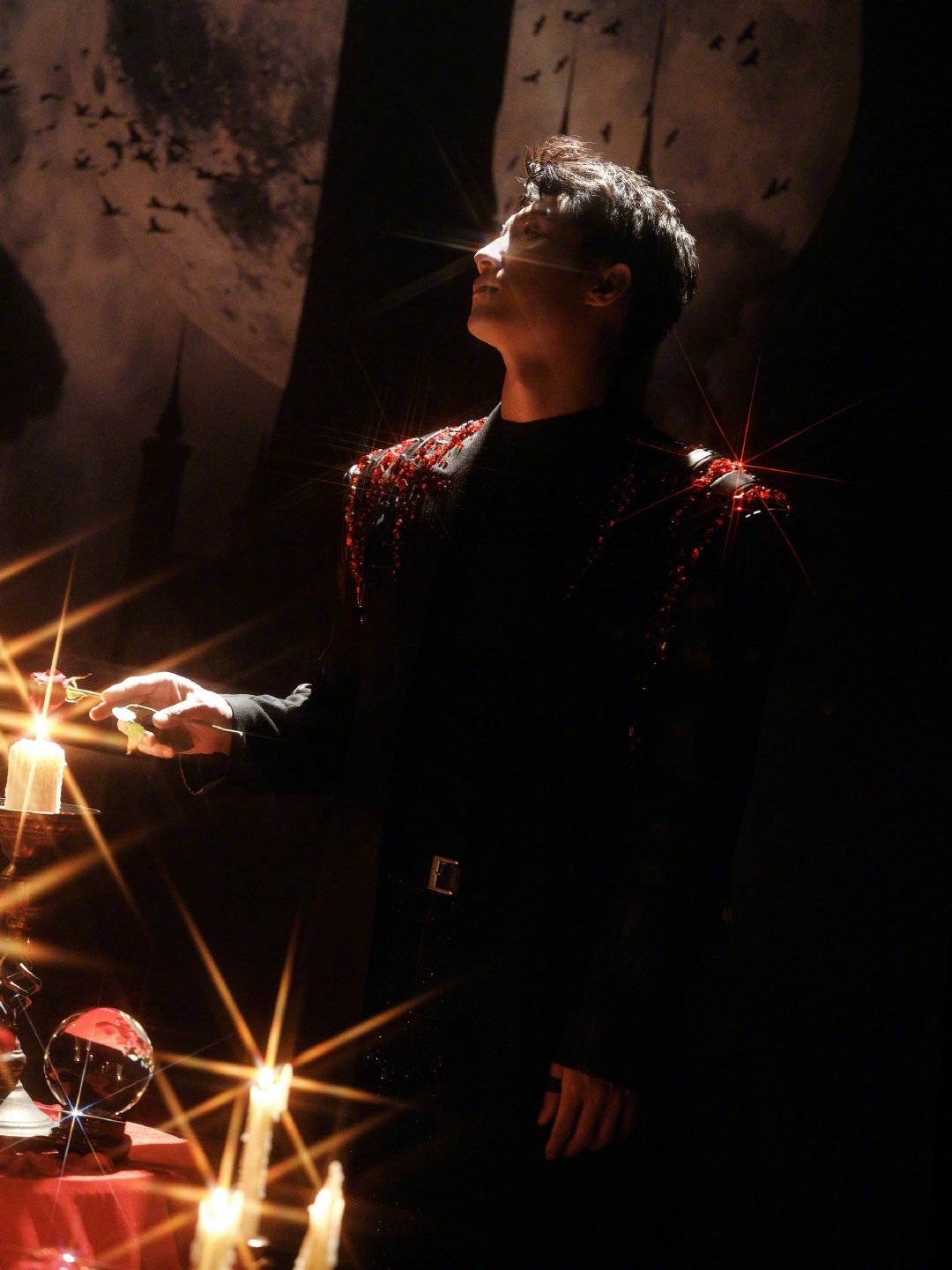 黄景瑜我嘞个暗夜伯爵 无需繁复背景,仅凭一抹烛光、一朵玫瑰与一身缀满红色珠饰的黑衣,黄景瑜便构筑了完整的叙事穹顶。他是来自暗夜的伯爵,以美貌为刃,以气质为蛊,在跨年之夜进行一场无言的征服。