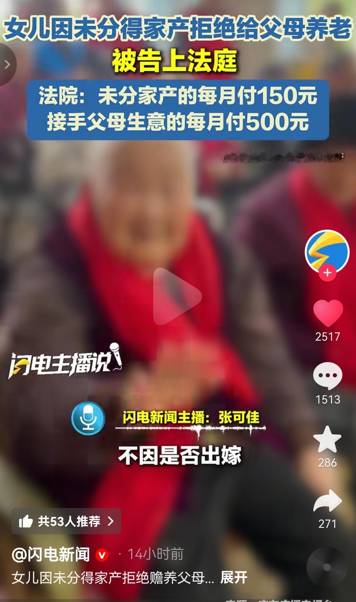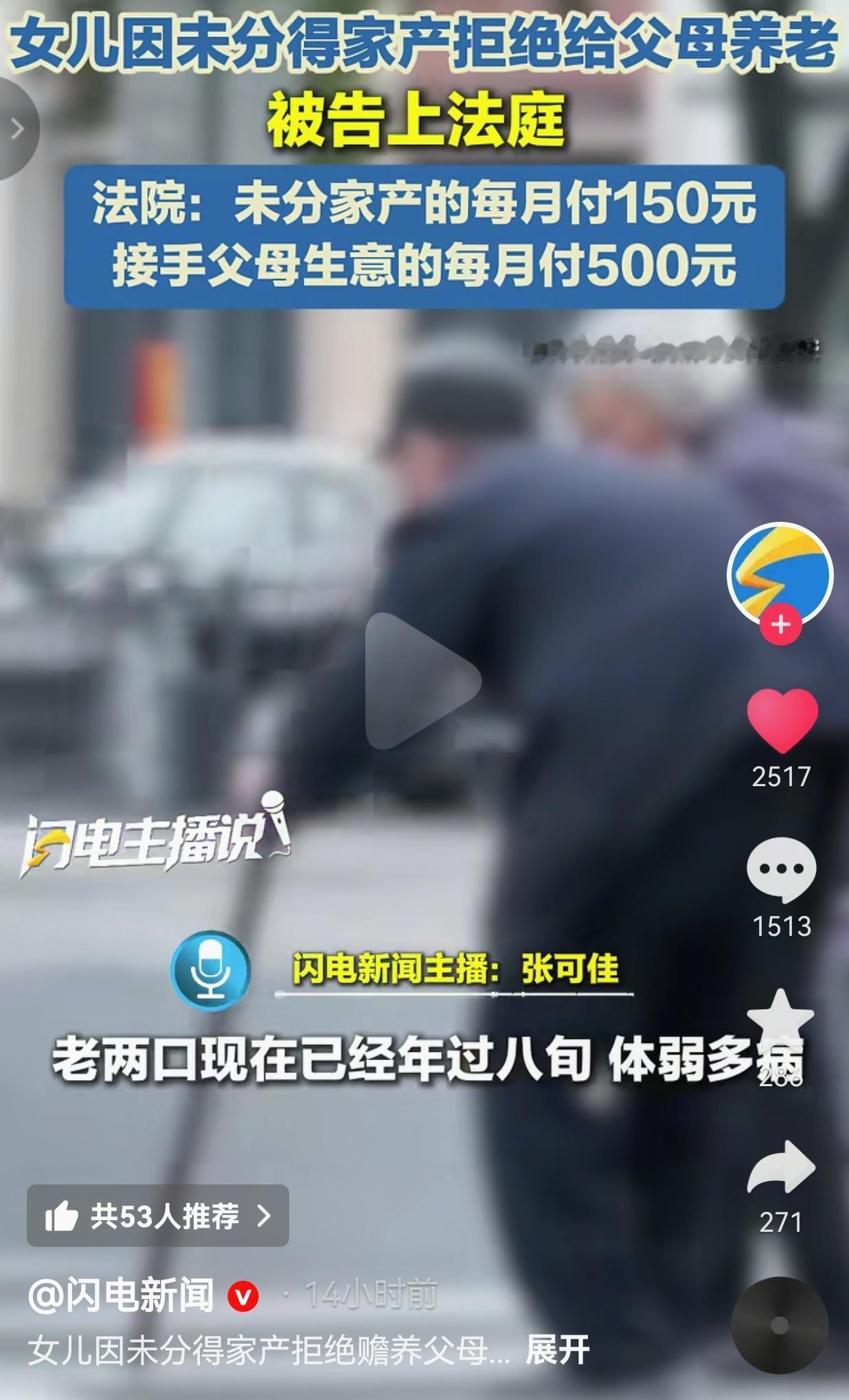 女儿因未分得家产拒绝给父母养老,老人无奈将女儿告上法庭,法院判了:未分家产的每月