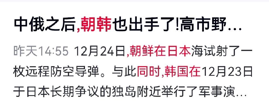 好消息,是真的啊! 朝韩两国罕见同时对日本亮剑。朝鲜试射导弹,韩国在独岛附近军演。 日本眼见外交乱成一锅粥,高市早苗只好喊话中国,亮出所谓守护日本利益、荣誉和国民生命的“三大使命”,还放弃原本参拜靖国神社的计划。 高市早苗若继续装傻充愣,不改正错误,不仅完不成使命,还可能把日本推向深渊,成为日本的“掘墓人”。 对此你怎么看?