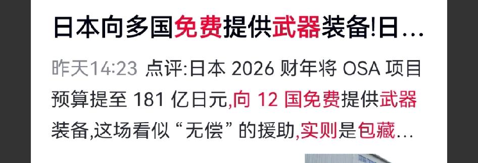 向12国“免费送武器”,看似善举,实则包藏祸心。从北边的蒙古到南边的菲律宾,日本企图在周边布下“防波堤”,让别国替自己挡险,同时为其军工扩张铺路。 这种捆绑他国后勤、变相推销军火的做法,背后藏着复活军事野心的算计。 日本这种免费军援的糖衣下,是挑动地区对抗的陷阱。它不仅会加剧东南亚军备竞赛,破坏地区和平稳定,更让日本从 “和平国家” 向 “军事输出国” 的转型愈发露骨。 但所谓的“包围圈”在绝对实力面前不过是幻想。若真要玩火,挑衅的代价必将指向东京自身。到头来,这不是送礼,而是给自己引来火力。 对此你怎么看?