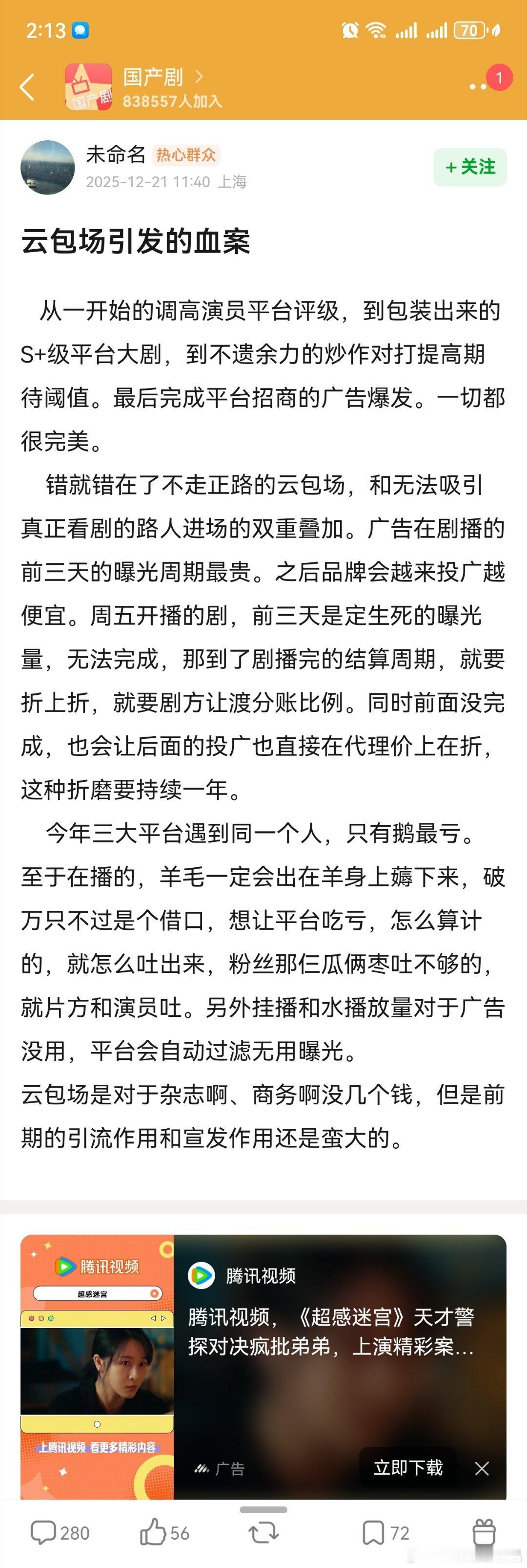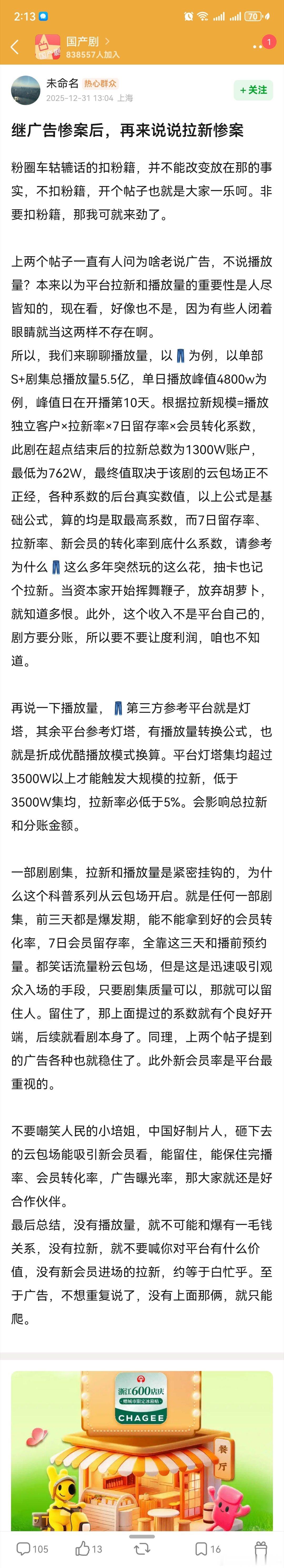 老呃家广告、拉新、云包场引发的血案 。能让真业内写这么多字出来锤他,从这个角度想,老e家这一套营销方案还挺复杂的。 长安二十四计 最后总结,没有播放量,就不可能和爆有一毛钱关系,没有拉新,就不要喊你对平台有什么价值,没有新会员进场的拉新,约等于白忙乎。至于广告,不想重复说了,没有上面那俩,就只能爬。