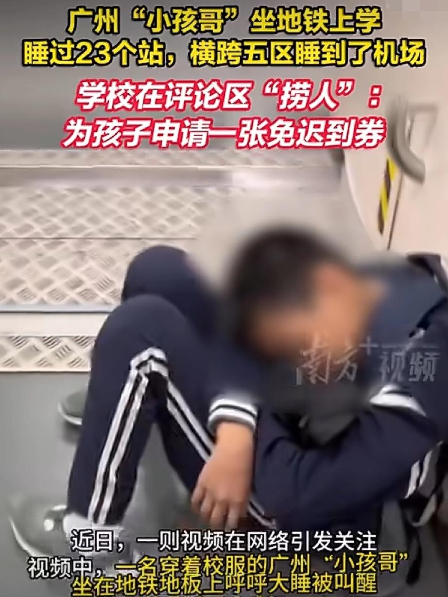 你见过坐地铁能睡到机场去上学的吗?广州这娃儿,一觉睡过23个站,横跨五个区,直接干到机场了。 12月29号,周一早高峰。地铁3号线里人挤人,这孩子坐在车厢过道上,睡得死沉。 一位赶飞机的汪女士到终点站机场北站,才发现他。叫醒一问,娃睡眼惺忪地说要去汉溪长隆站上学。 好家伙,从番禺到花都,23个站,五个区,一个多小时的车程,全睡过去了。 视频传到网上,大伙儿又好笑又心疼。好笑的是这“续航”能力,心疼的是这孩子得累成啥样。 关键戏来了,孩子就读的加拿达外国语学校直接在评论区回复:“正为孩子申请一张免迟到券和一个小枕头,感谢博主帮忙,不然得去机场捞人了。” 这话一出,网友笑喷了了。见过发奖状的,没见过发“迟到券”的。 评论区里有人调侃:“花都欢迎你,来都来了玩会儿再回去。”也有人叹气:“小孩们都卷到这个程度了,还要我们继续生。” 说实话,我见过太多学校遇到这种事,第一反应是通报批评、叫家长写检查。这学校倒好,不仅没罚,还主动给“免死金牌”。 一张迟到券背后是明白:孩子不是故意犯错,是真的累了。这种共情能力,在教育圈简直是一股清流。 想想我们小时候,谁没在课堂上打过瞌睡?谁没因为赶作业睡过头?成年人的世界讲人性化,到了孩子这儿就只剩规矩和惩罚,这不公平。 教育的本质是培养人,不是把人培养成机器。一个能对孩子说“没关系,累了就睡会儿”的学校,教出来的学生心里才有光。 今天能给迟到券,明天就能理解孩子的各种“小意外”。这种教育温度,比啥名校光环都强。 毕竟,谁不想在一个被温柔以待的环境里长大呢?