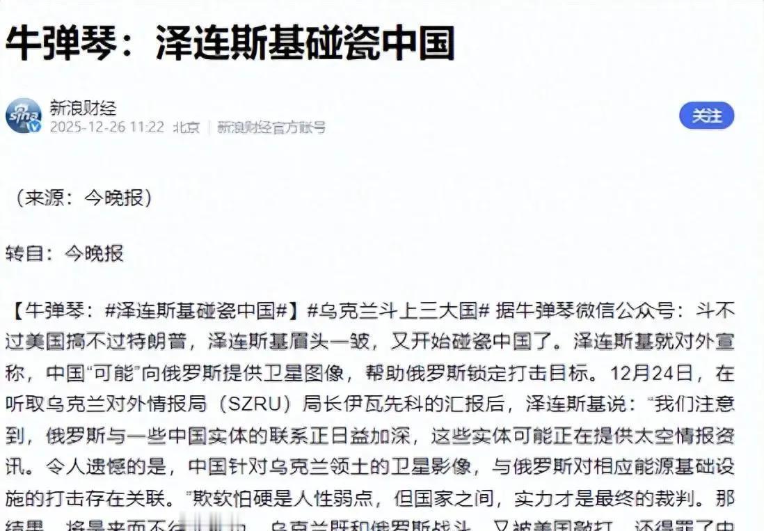 泽连斯基把乌军吃亏,怪到中国头上,这话靠谱吗? 2025年末,他再次暗示“要不是中国帮俄罗斯,乌克兰不会这么惨”,把中国推向俄乌战场的阴影角落。可战场现实摆在那儿:拉锯消耗接近四年,前线推进有限,乌军兵员紧张,美欧军援还频繁拖延、打折。 乌克兰国内压力也不小,媒体统计的贫困率接近四成,冬天不少城市限电限暖,普通家庭靠烧木柴、用电烤箱熬日子。这样的氛围里,领导人把责任外推,很符合政治本能——既向西方喊话“你们不能停援”,也给国内找个“外部背锅”。 他口中的“卫星帮俄军瞄准”说法,更像是情绪化指控。低轨卫星本来就每天密集掠过乌克兰上空,美国、欧洲的也在,单靠“时间点重合”就下结论,很难经得起推敲。更何况,中国对外强调遥感数据以民用为主,并非乌战场的专属服务。 从公开政策看,北京对俄乌冲突一直用“劝和促谈”表述,中国文件里列过“停火止战、恢复和谈、保障粮食通道”等主张,还派特使在基辅、莫斯科和欧洲多国之间穿梭沟通,并通过联合国渠道向乌克兰提供食品和医疗物资。 如果说这场战争谁的牌更关键,很多欧洲观察人士更关心的,还是美国国会的拨款节奏、欧盟下一轮援乌预算,以及俄军工业能否在制裁下维持产能。中国被动卷入舆论争议,反而容易冲淡真正左右战局的变量。 在这种多方博弈里,把一切归咎于某个“第三方帮凶”,或许能暂时缓解政治压力,却难以改变乌克兰战场和经济的现实,和平谈判在多数条件下仍更像唯一有希望的出口。
