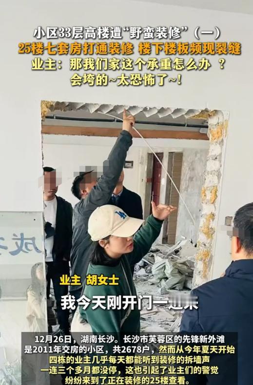 “真是吓破胆了!” 长沙一女子住24楼,楼上25楼竟然把7套房全打通,还砸了承重墙! 现在她家墙面裂满缝,楼上8层的重量全压下来,吓得她不敢住人,房子更别想租出去了。 承重墙可是整栋楼的“命根子”,一动就威胁所有业主安全。 这哪是装修?简直是拿一百多户人的生命开玩笑!物业怕事不敢管,但咱们业主不能怂。 赶紧团结起来,投诉、报警、集体阻止施工,绝不能等楼塌了才后悔。安全面前,谁都没特权,必须严惩这种行为!