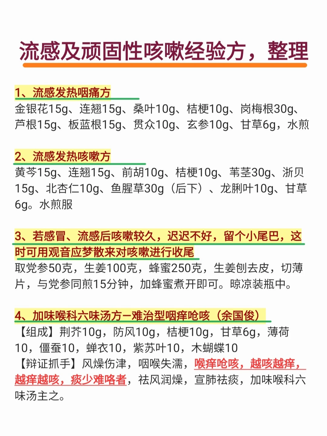 秋冬流感高发季,很多人有这样的经历:感冒发烧好了,却留下了恼人的"后遗症"——咳嗽迁延不愈,少则一两周,多则月余,给生活和工作带来诸多不便。这种感冒后遗咳嗽,在中医看来并非偶然,而是身体状态的一种重要信号。 中医将这种咳嗽称为"外感后咳嗽"或"余邪未清",主要是因为以下几点: 1⃣️余邪留恋,肺气不宣 流感初愈,表面邪气虽退,但部分bing邪可能仍滞留于呼吸道。 2⃣️ 正邪交争,损伤肺阴 流感后期常表现为干咳少痰、咽干喉痒,这正是肺阴受损、虚火上炎 3⃣️脾虚生痰,肺失清肃 中医认为"脾为生痰之源,肺为贮痰之器" 📖查了很多资料,总结了很多名老中医经验,整理了一些咳嗽的方子供大家学习,比如 ①加味喉科六味汤方—难治型咽痒呛咳(余国俊) ②郭子光:咽喉干咳止痒汤 ③前胡止漱散(郭永来方) ④金沸草散(江尔逊方) ⑤邓铁涛:祛风宣肺止咳方 等等 💐收集了很多方子,都是好方子,但是很苦口,很多人坚持不下来,还得费时费力的煎煮,又不好保存,其实不用这么折腾,可以看看这个复方平贝口服液,也是管咳嗽的,组成包括:熊胆粉、平贝母、茯苓、陈皮、紫菀(蜜炙)、板蓝根、白前(蜜炙)、前胡、百部(蜜炙),适用咳嗽频剧,身热咳痰不爽,痰多色黄,口渴咽痛,尿黄便干的人群,可以快su止咳,清热化痰,一般喝完半个小时左右也不会怎么了咳了,次 10 ml,日 2 次 🎋在使用药物调理的同时,配合以下生活方式调整,效果更佳: ✅环境加湿:保持室内湿度在50%-60%,缓解呼吸道干燥 ✅呼吸训练:练习腹式呼吸,增强肺功能 ✅适度运动:症状缓解后进行散步、太极拳等温和运动 ✅情绪调节:避免焦虑紧张,因忧思伤肺