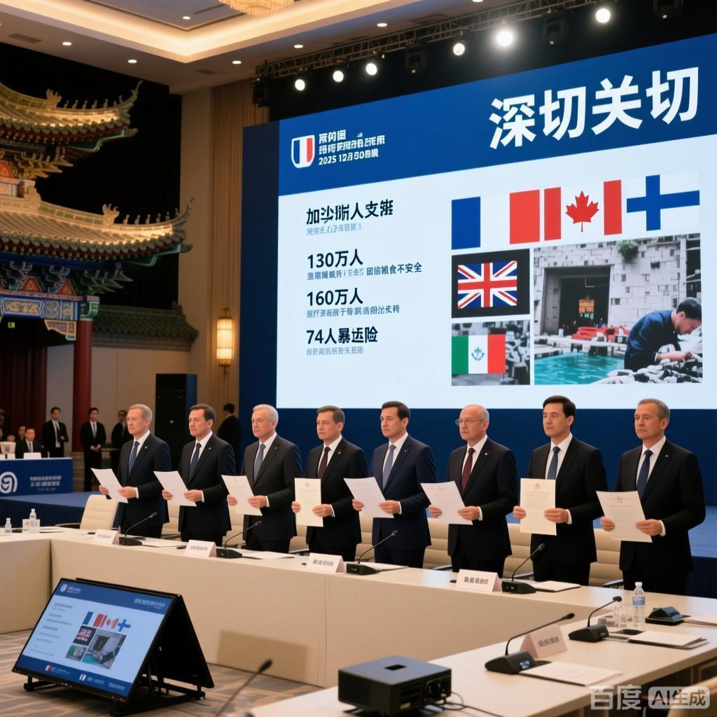 英法加拿大等十国联合声明 当地时间12月30日晚,法国、英国、加拿大、丹麦、芬兰等十国外长发布联合声明,对加沙"灾难性"人道局势表示"深切关切"。声明指出,约130万人急需避难所,160万人面临严重粮食不安全,医疗系统仅部分运转,74万人暴露于有毒污水风险。十国敦促以色列放宽援助限制、开放边境口岸,保障联合国及国际组织运作,并解除对医疗设备等"军民两用"物资的进口限制。 此次联合声明罕见集结北欧、G7及中立国,被视作向以色列施压的"外交包围网"。舆论认为量化援助指标(每周4200车次)将人道危机转化为技术性问责,但以色列极右翼强硬回应凸显执行难度。网友讽刺"粮食换火箭弹"论调,专家指出声明暴露巴以冲突中人道主义与地缘博弈的深层矛盾。