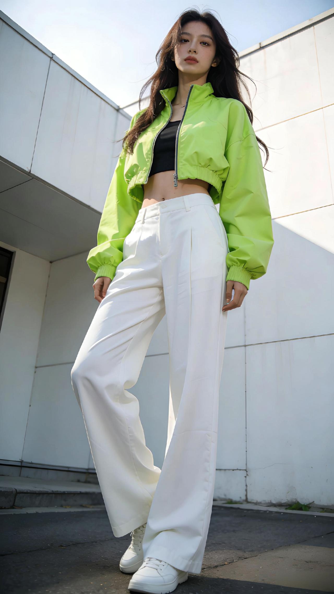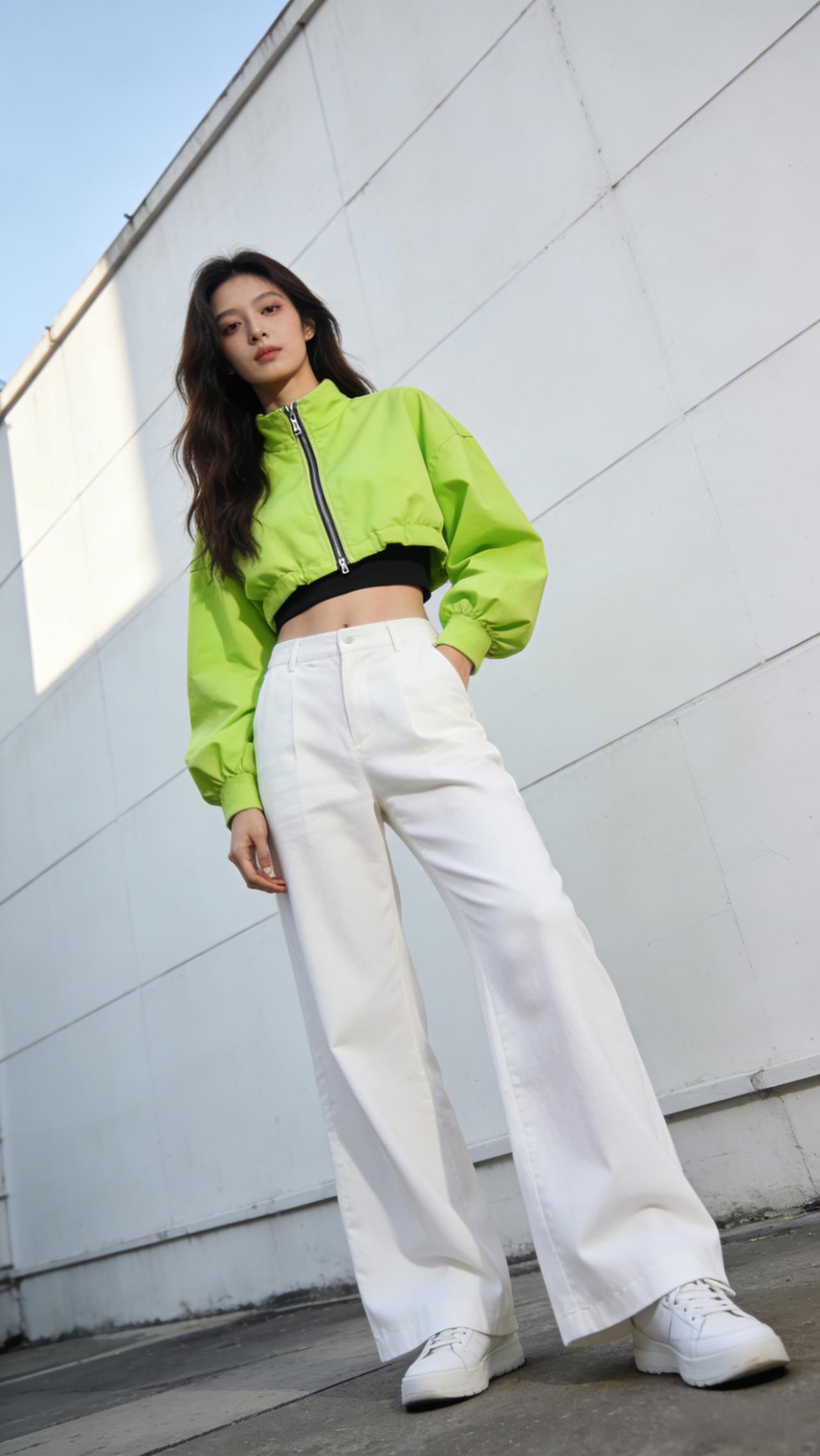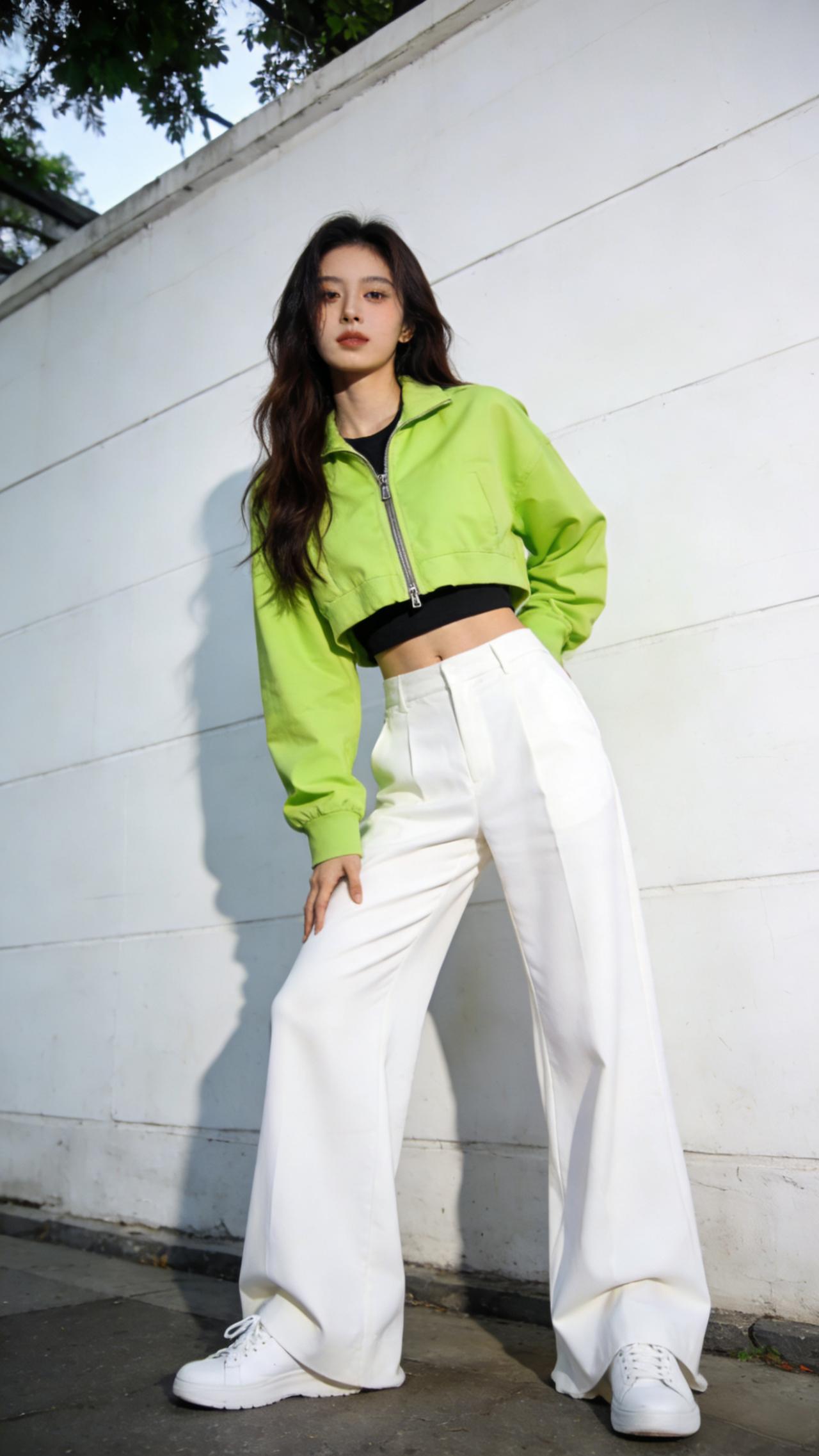穿亮绿色夹克和白色裤子的女生,简直是街头一道亮眼的风景。就像今年流行的“绿蜜蜂色
