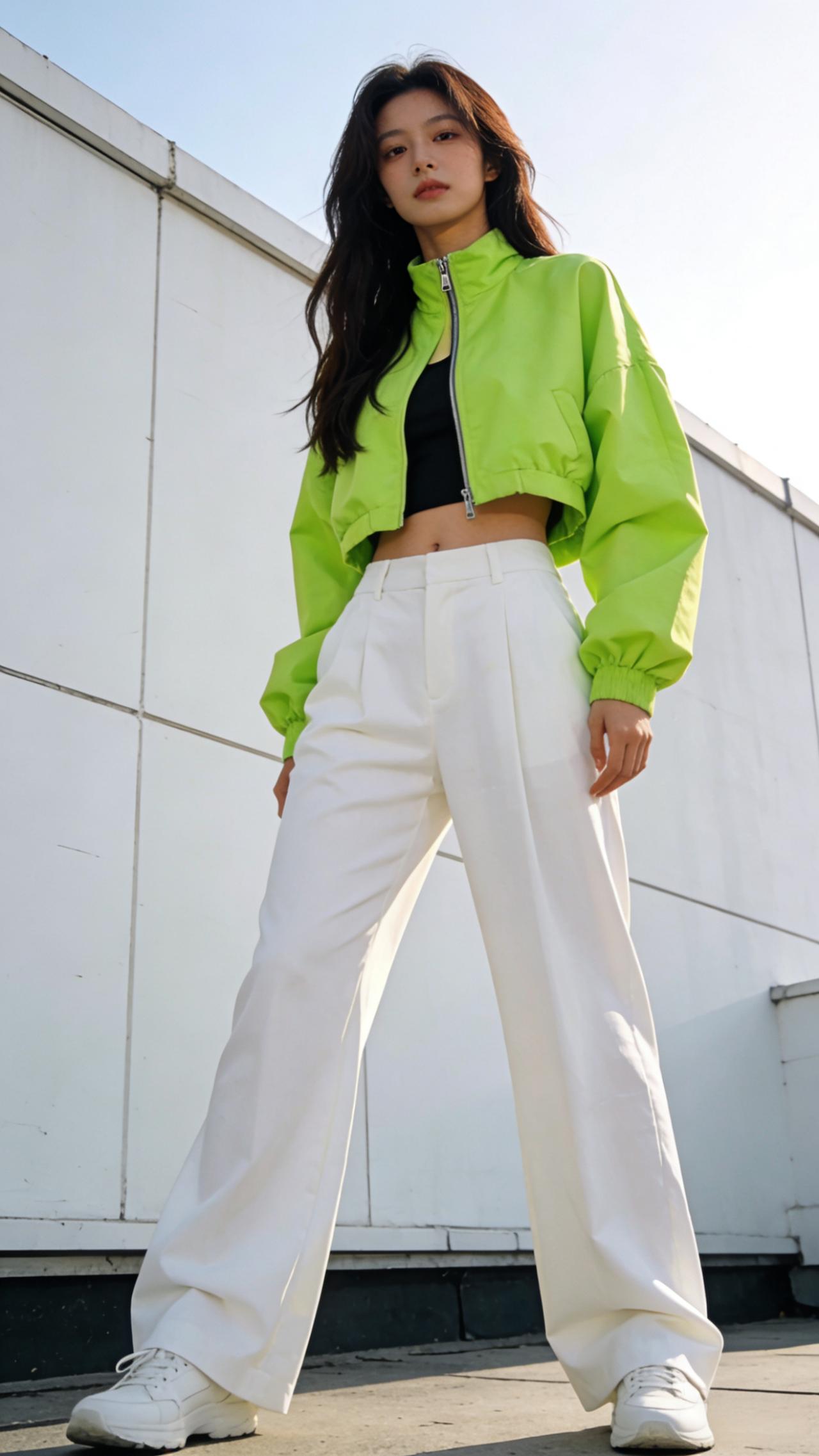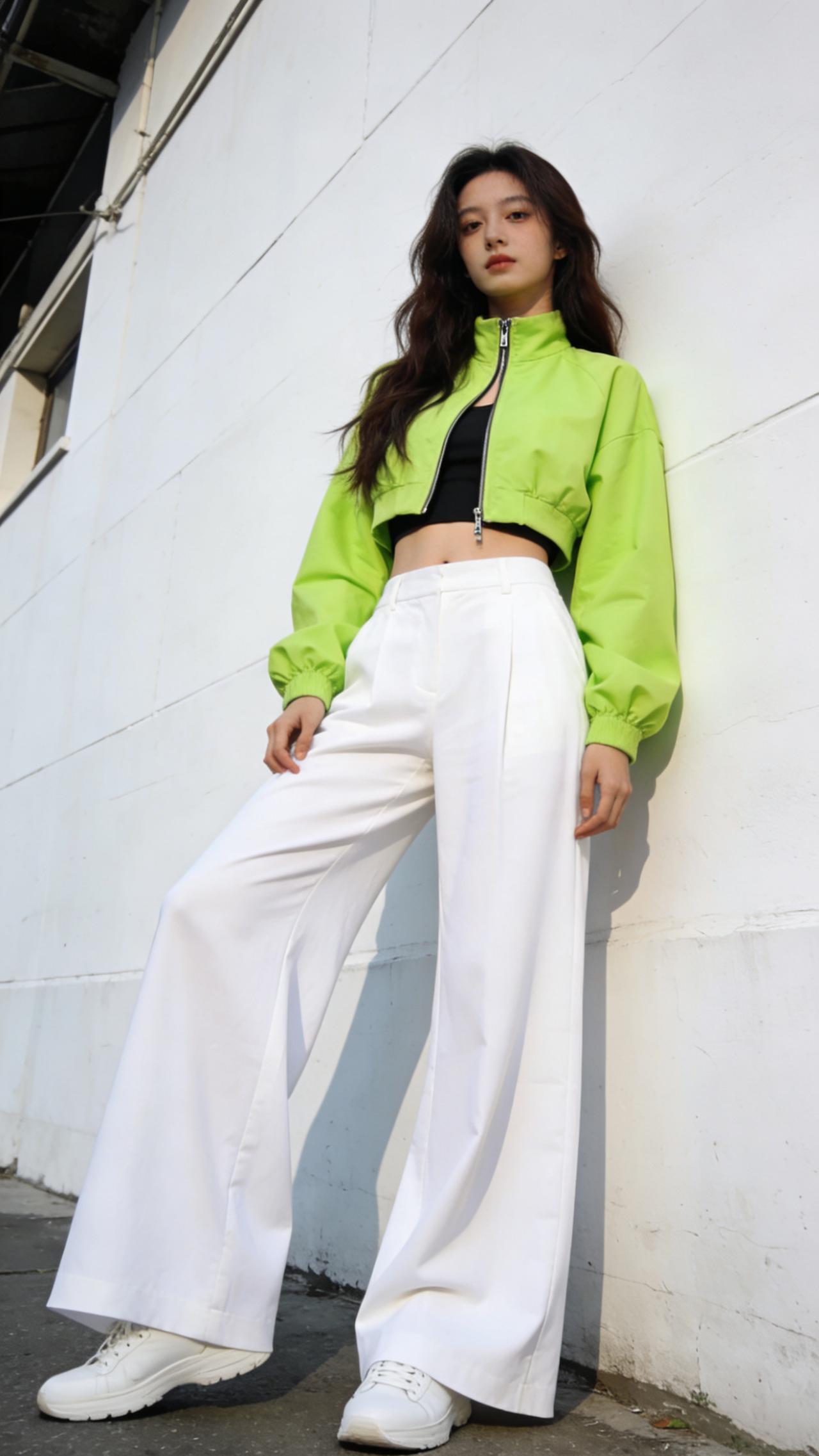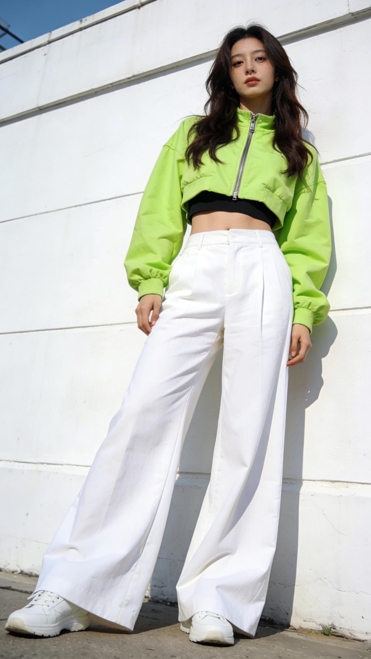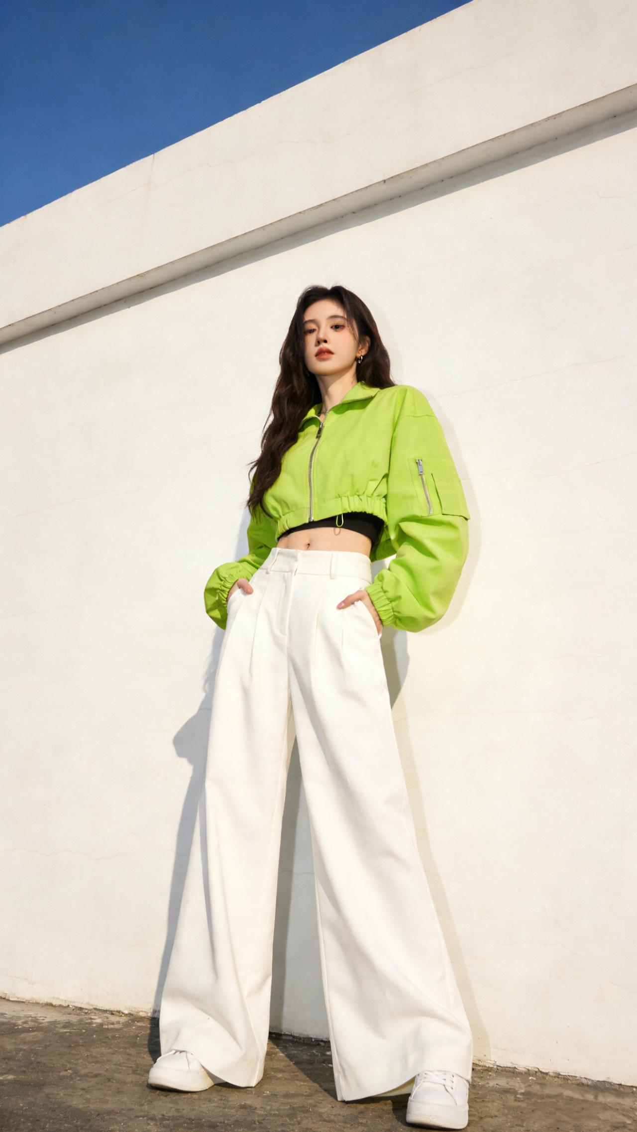 穿亮绿色夹克和白色裤子的女生,简直是街头一道亮眼的风景。就像今年流行的“绿蜜蜂色