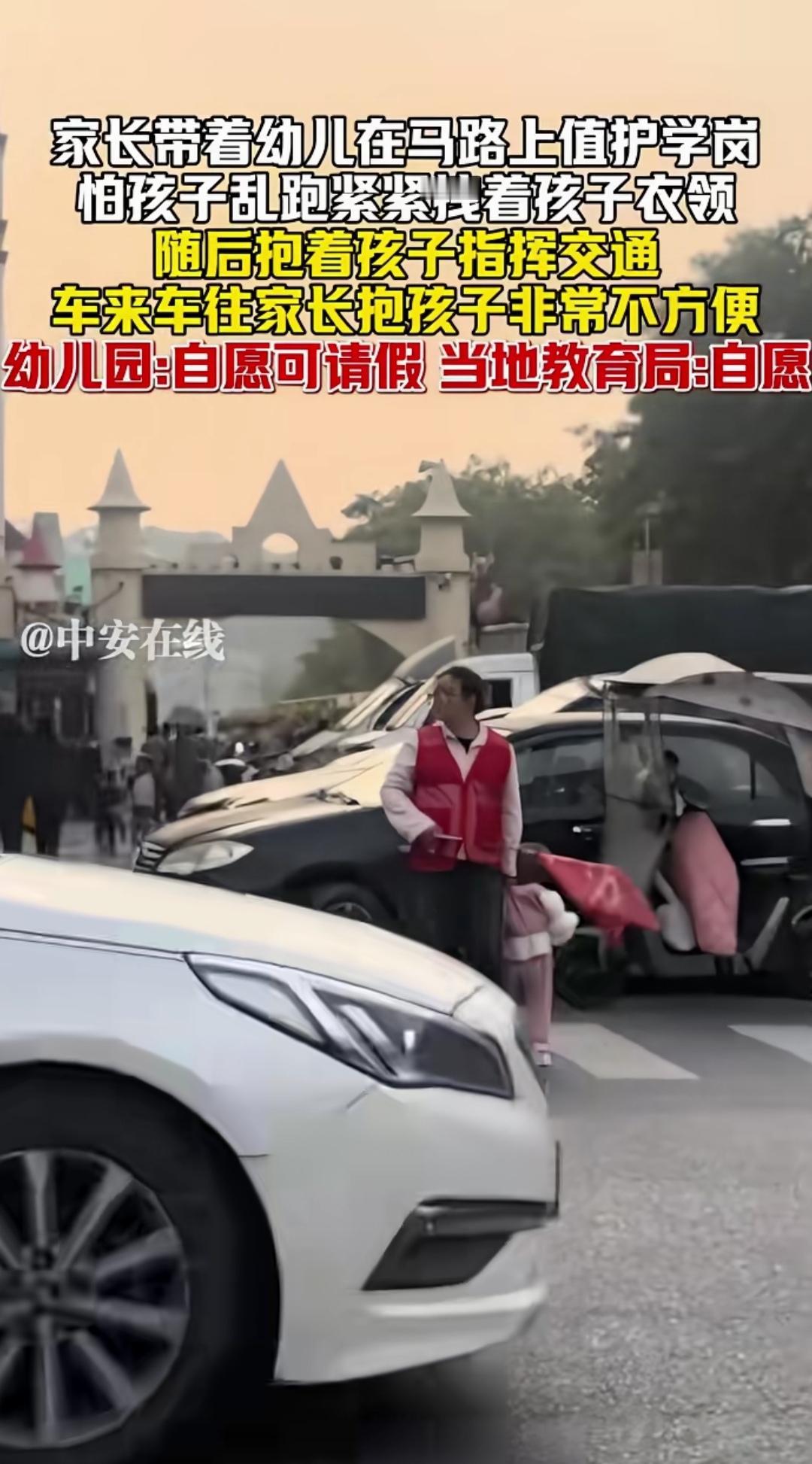 又是“自愿”,为何事情一经曝光,当地学校和教育部门就坚称是家长自愿的?难道其中不存在学校布置的“软任务”吗?难不成学生家长真的闲得没事干,非要到学校抢着当“自愿”者? 瞧瞧画面中这位正在护岗的家长,身旁还带着个小孩,时刻得留意自家孩子别乱跑。可就是为了响应学校的护岗任务,他毅然站在车来车往的马路中央。虽说穿着反光背心,手中还挥舞着红旗,但身边有小孩,难免会分心。要是这时恰好有车经过,稍有不慎,就可能被车撞到,实在太危险了! 这一幕被网友拍了下来,上传到网上后,立刻成了网友热议的焦点。此时,该幼儿园也意识到曝光后的影响,赶忙出来澄清,称是家长自愿的,还可以请假。当地教育主管部门也出面表示是家长自愿的。 或许,家长真的是出于对孩子们安全的考虑,自愿来护岗。但作为主体的幼儿园,难道没有配备保安护岗吗?而且,以前怎么没听说过家长护岗这回事呢?学校会不会让老师布置了这种“软任务”呢? 在我们这儿,为保障学生安全,放学时,为维护交通秩序,学校门口除了有保安,还设有与派出所连通的警务室,交警也会来执勤一段时间,家长则只需负责接孩子。